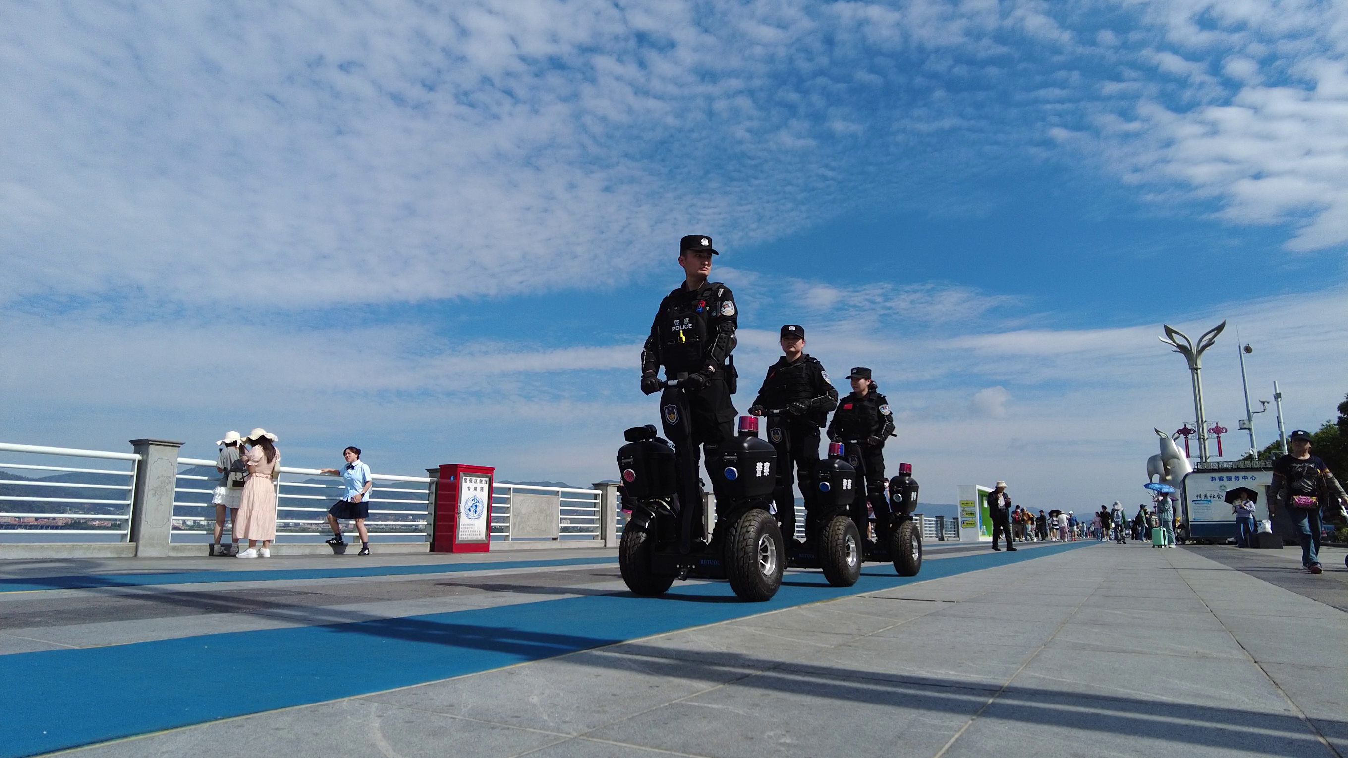 度假分局依托情指中心,统筹协调景区指挥调度、沟通协作、交通疏导、视频巡查各项工作,为快速反应、融合作战提供指挥体系保障。针对工作日、周末节假日观鸥客流差异,按照“重点覆盖、战时叠加、动态布防”原则,分局采用机动勤务模式,周末及节假日全员上岗,投入警力数较工作日增加3倍,设置前置治安处置点5个、摩巡组2组、平衡车巡逻组2组、重装巡逻组1组、瞭望哨1个,形成“小、快、灵”的末端服务保障网络。今年“观鸥季”以来,及时劝阻“圈地拍照”“尾随销售”等不文明从业现象60起,快速调解摄影、停车、买卖、排队等纠纷90起,帮助群众找回走失儿童23人、找回遗失物品35件。