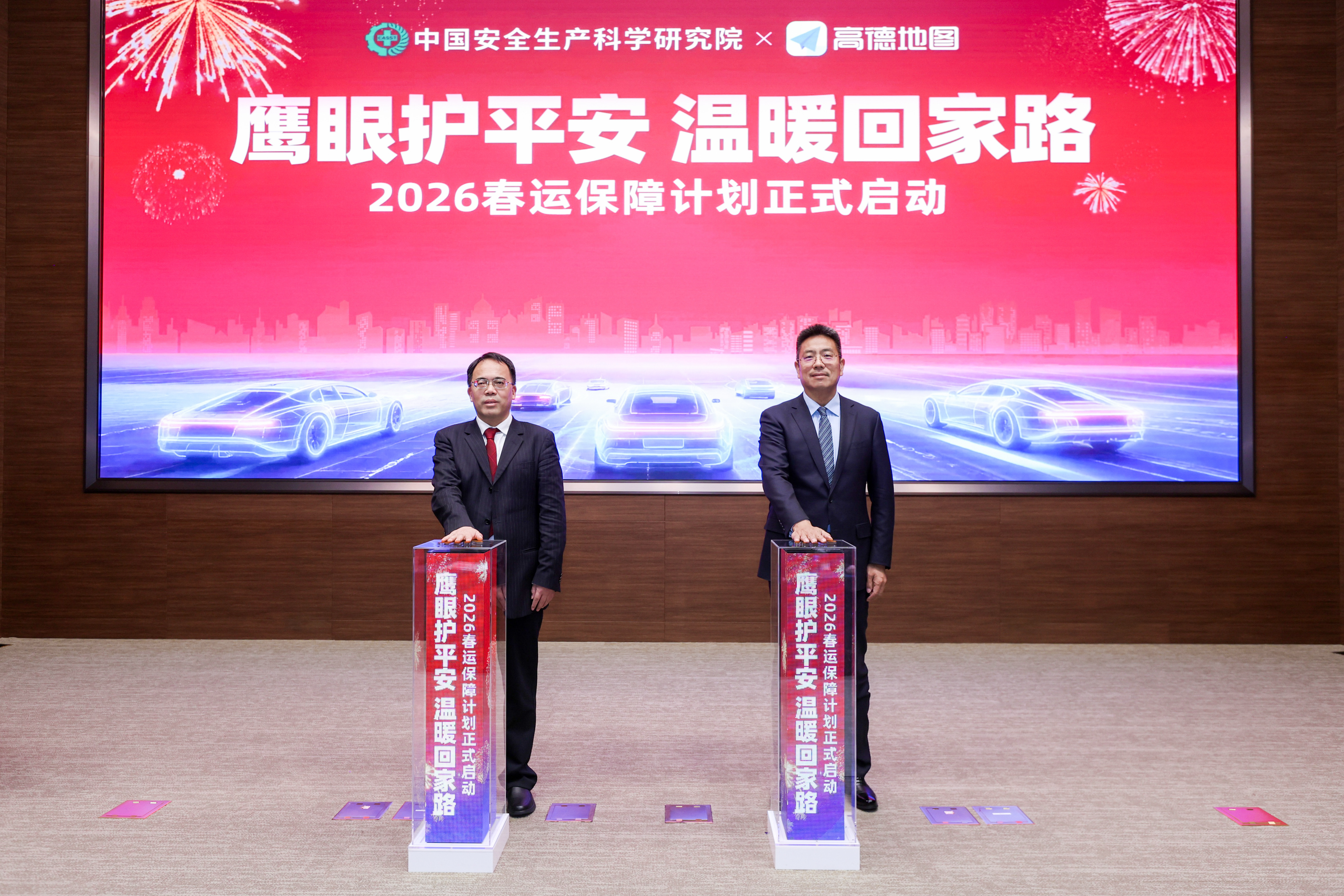 中国安科院院长周福宝(左)与高德董事长刘振飞(右)共同启动2026春运保障计划