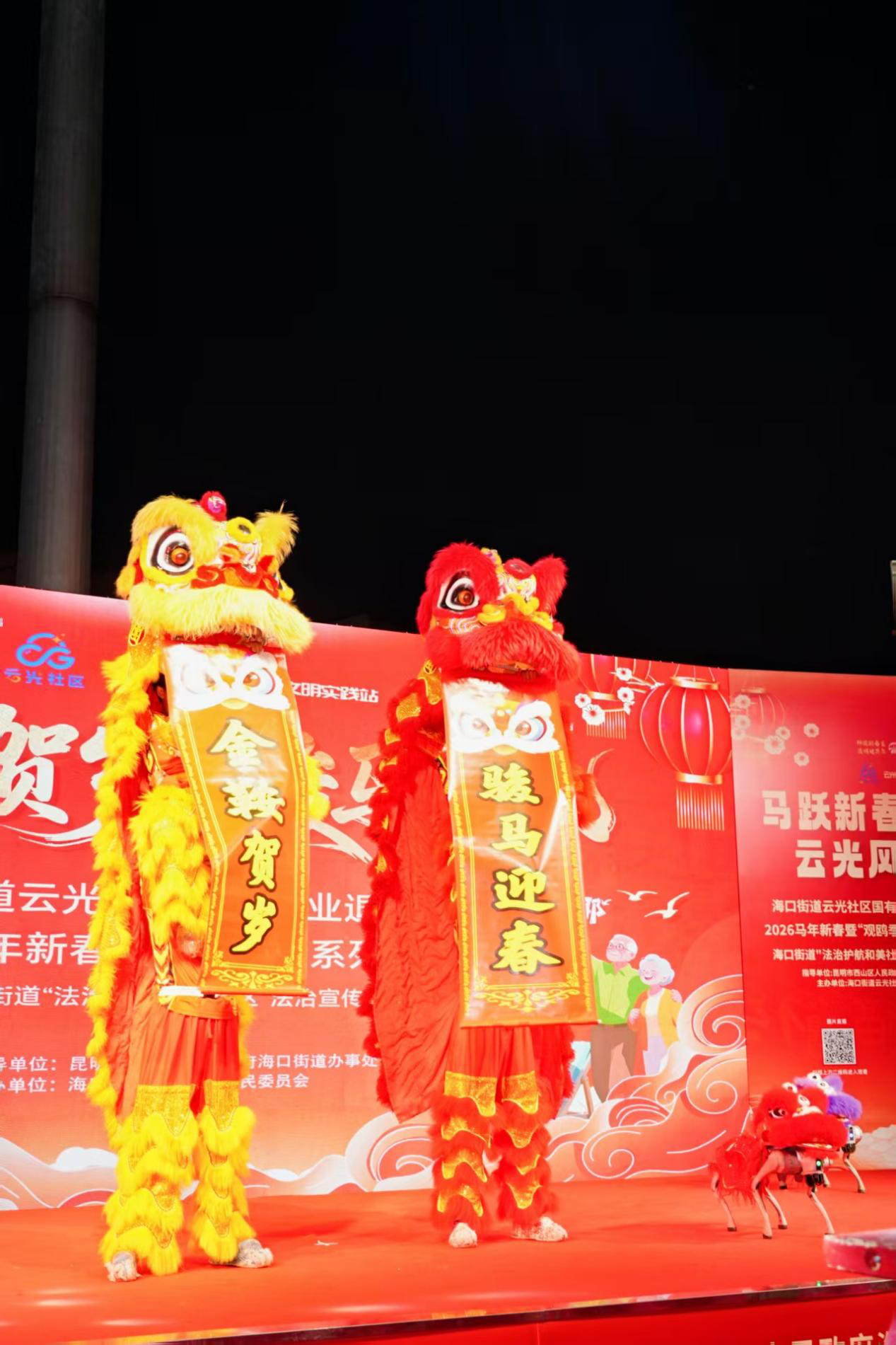 正值2026马年新春佳节即将到来之际,作为昆明市“神骏踏春至,昆明过花年”文旅主题活动及春城惠民演出的重要组成部分,在党建引领下,由昆明市西山区海口街道云光社区居委会主办的“金鞍贺岁 骏马迎春”国有企业退休人员2026马年新春暨“观鸥季”系列文化活动、海口街道“法治护航和美社区”法治宣传活动,于 2026年2月9日至10日在云光社区灯光篮球场圆满落幕。活动以“文化养老、智慧养老、便民利民”为核心,融合传统民俗、科技互动与民生服务,吸引辖区千余名国企退休人员、居民及家庭踊跃参与,为新春佳节注入了浓厚的欢乐氛围与民生温度。