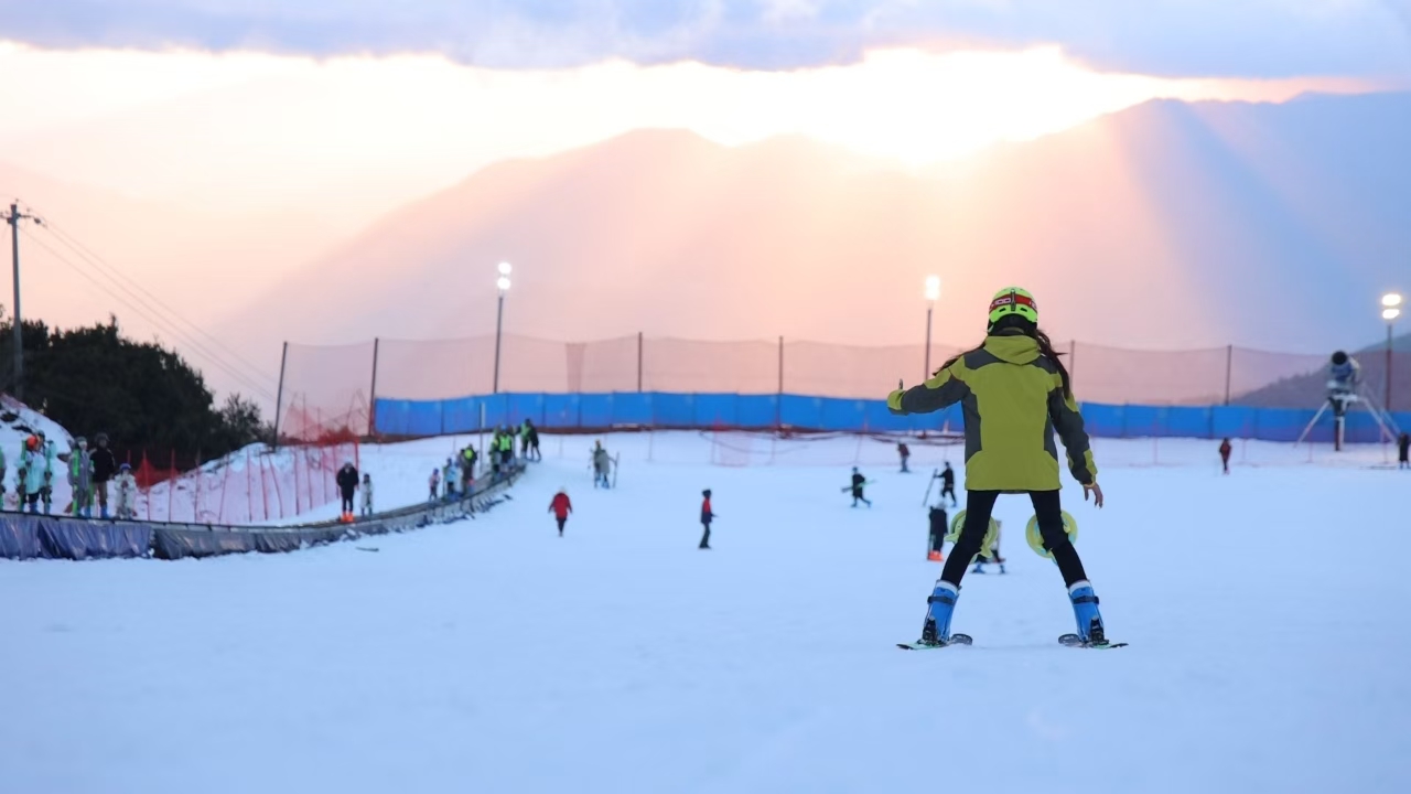 轿子山则依托其独特的自然景观,将冰雪运动与高山观光紧密结合。颜红军介绍:“营业延续至22:00。若白天意犹未尽,可于夜幕中继续徜徉雪道。更可立于高山之巅,邂逅夕阳沉入云海的动人景象,看滑行的轨迹与天际一同染上金辉,打卡此份山巅浪漫。”在第七届冰雪嘉年华期间,还推出了“先登山赏景,后下山滑雪”的多元行程。特别是傍晚时分,雪场专门开辟了日落打卡点,配备摄影师,让游客在雪道上记录下夕阳余晖。