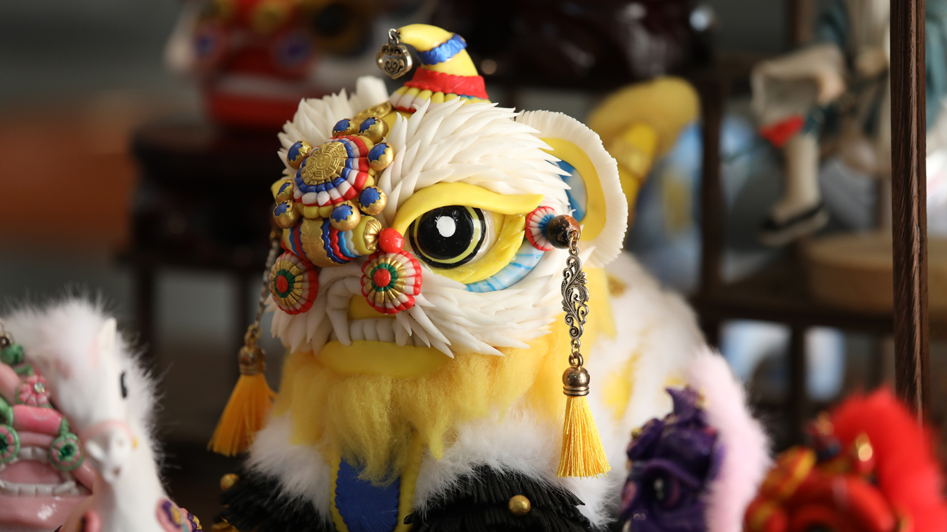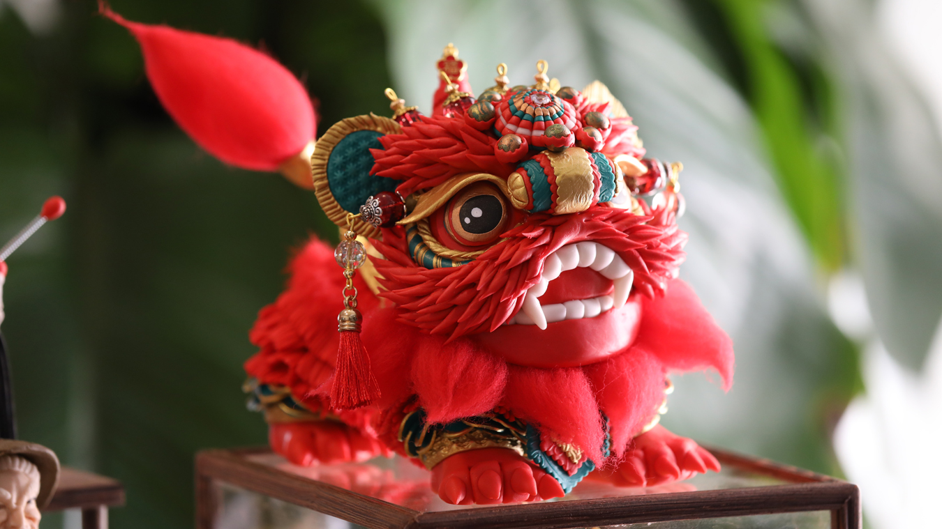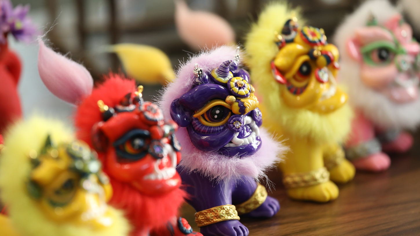 除了生肖系列,杨绍庆还创作了大量融合年俗文化与现代审美的作品:憨态可掬的生肖动物、融入京剧元素的关公脸谱,以及为年轻人设计的“没烦恼”摇头小福狮。后者以五行福狮为原型,通过俏皮的设计传递“摇头晃脑,没烦没恼”的轻松寓意,让传统手艺以更活泼的姿态走进日常生活。
