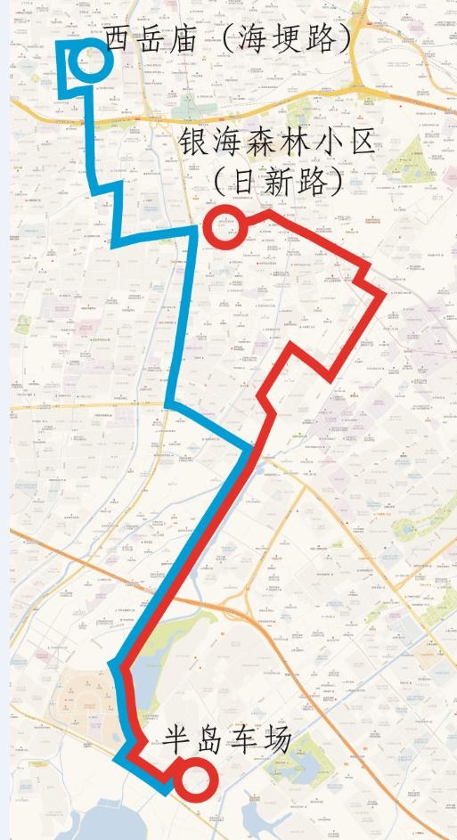 此次线路优化涉及K51路,其起终站由原半岛车场至西岳庙(海埂路),调整为半岛车场至银海森林小区(日新路),运营时间保持6:30—20:30不变。