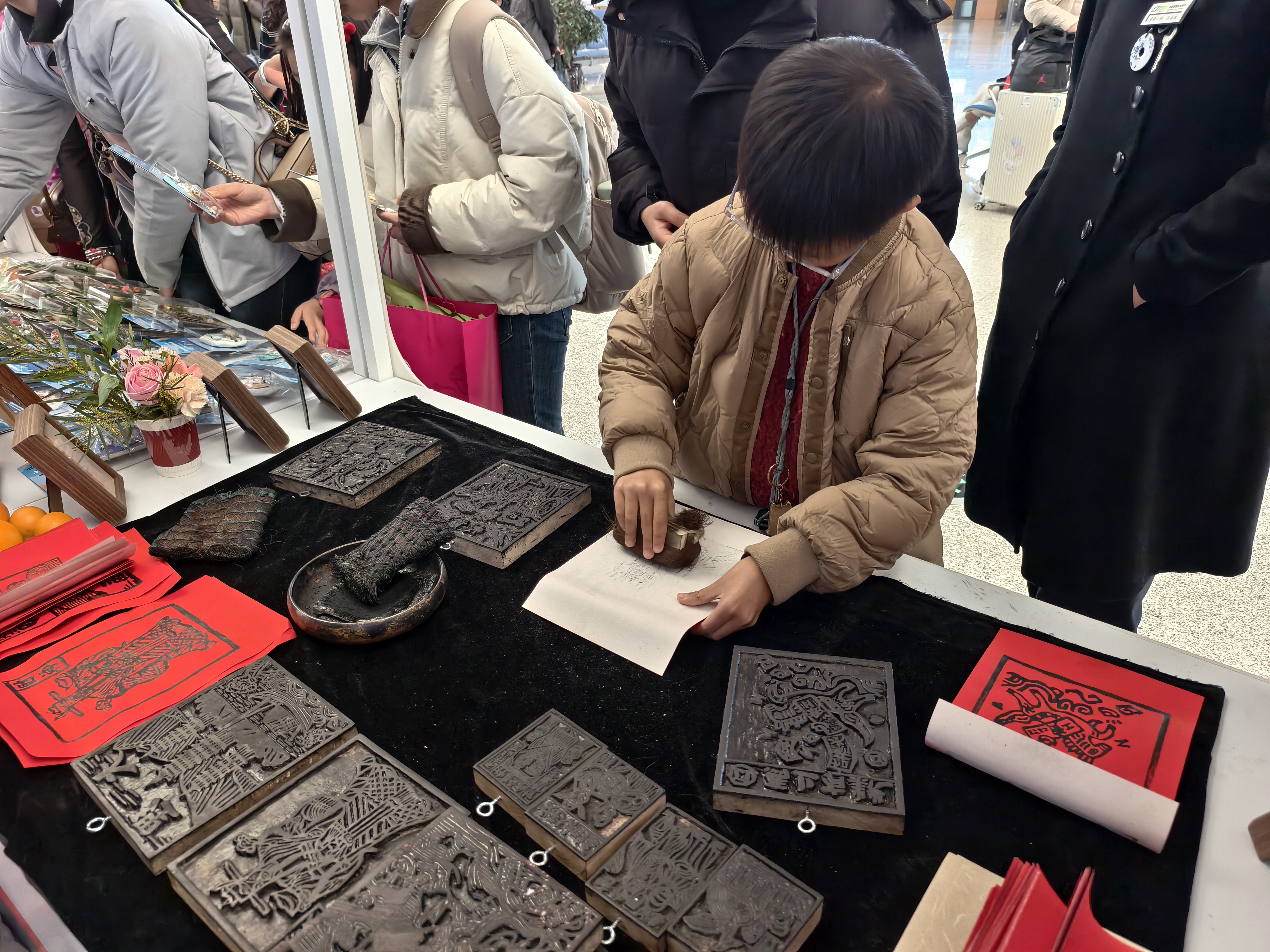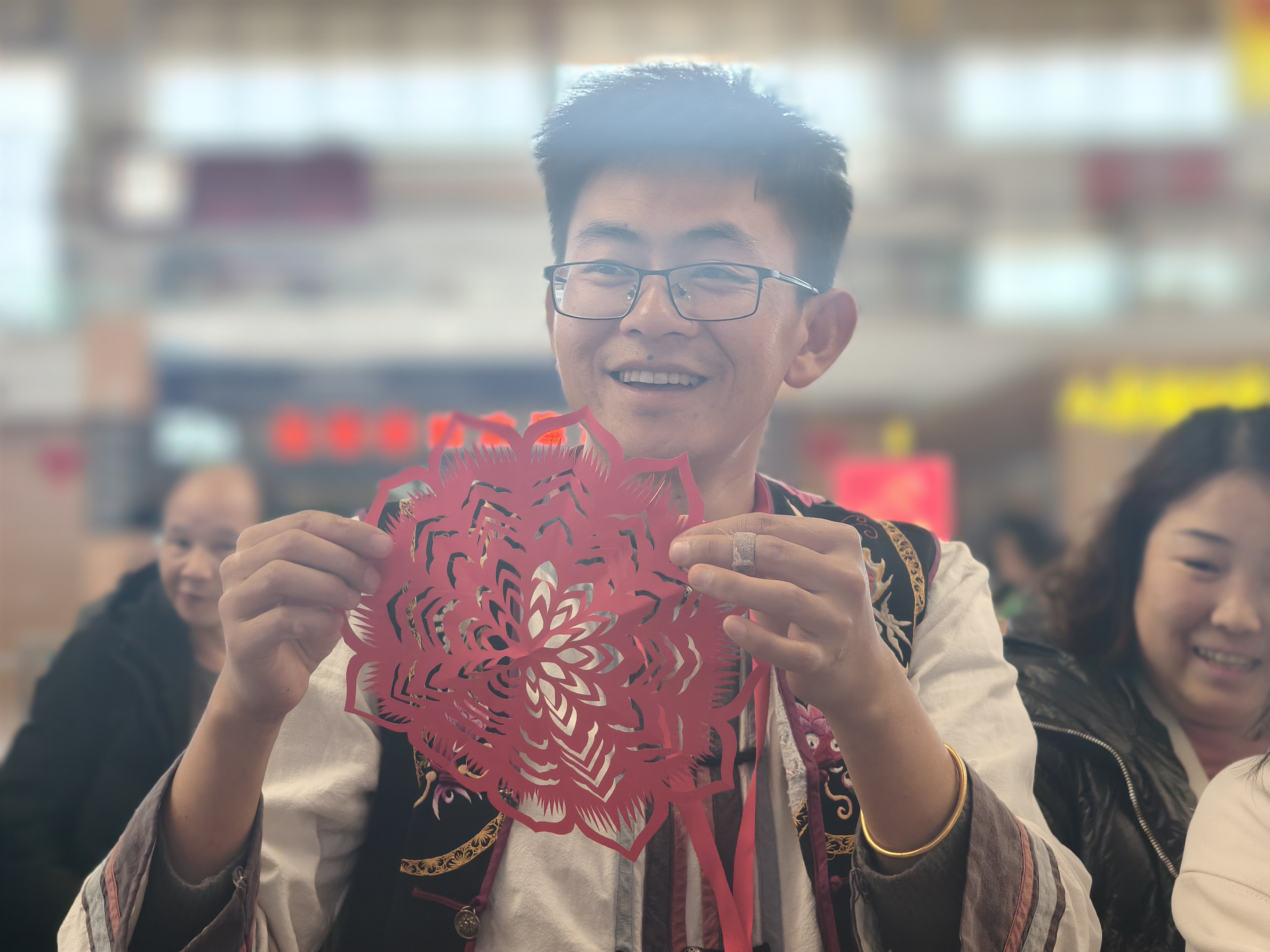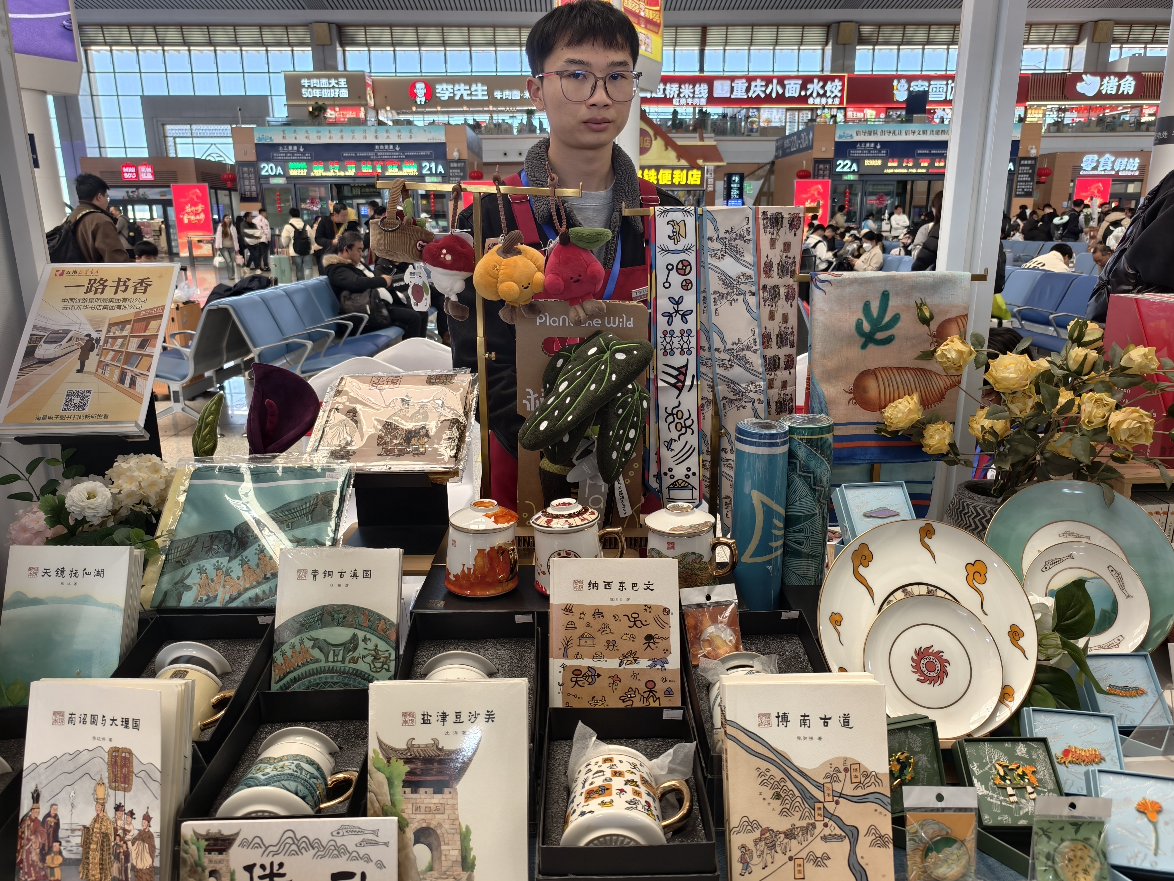 候车厅内24个“文化体验区”引人注目。在特色云品区,茶香、咖香、花香、果香四溢,让旅客离开云南的脚步再慢一点,对云南的留念更深一些。在非遗体验区,非遗代表性传承人展示甲马版画、捏面人、剪纸等技艺,并现场邀请旅客参与体验。
