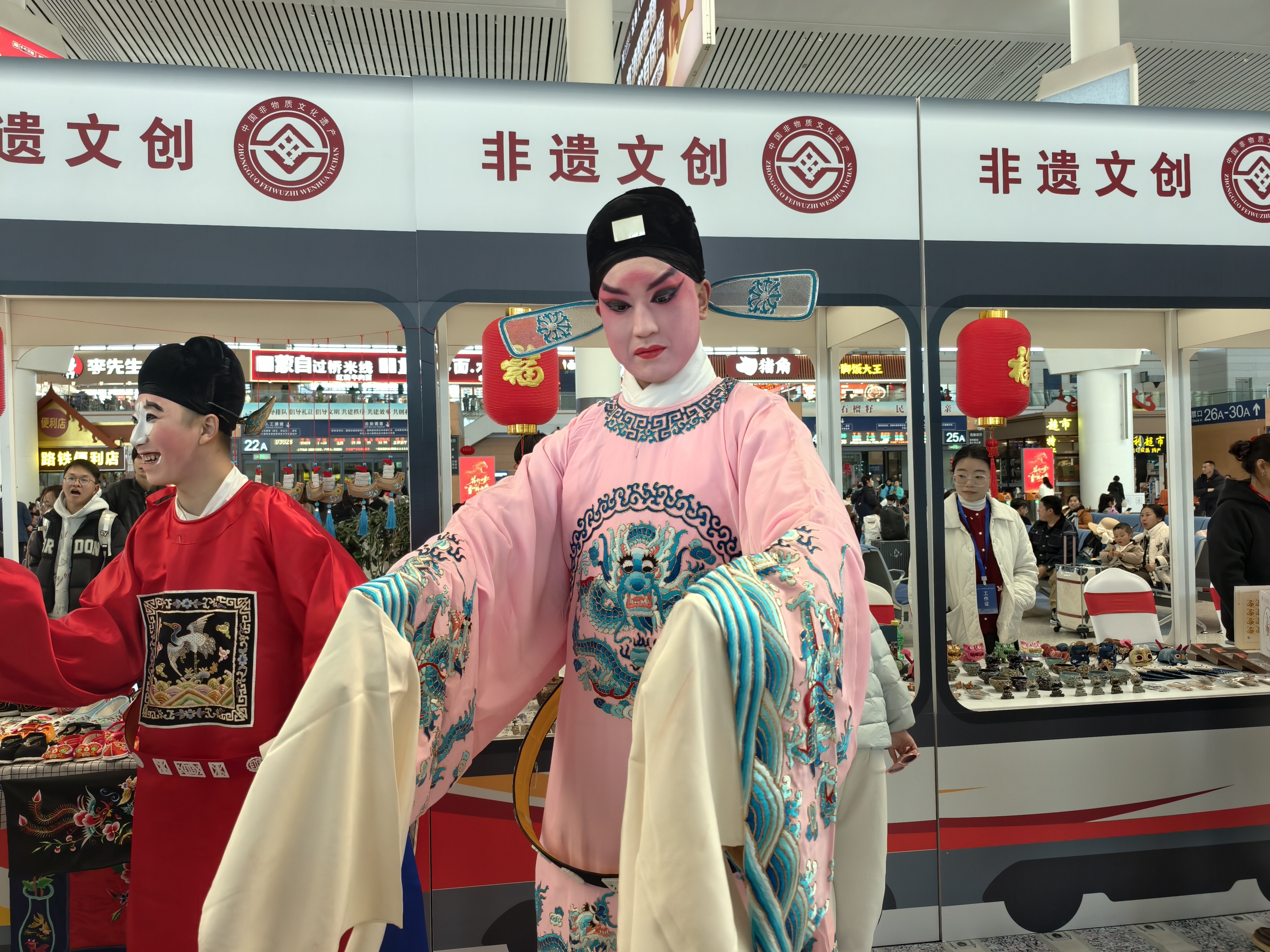 在文创展示区,集合了生、旦、净、丑扮相的滇剧妆造演员集体现身,让旅客能够尽情快闪打卡、互动拍照;10位书法家现场挥毫泼墨,为旅客写楹联、送福字,让年味儿更浓。“福字到手,回家不愁。”旅客们喜笑颜开,为活动点赞。