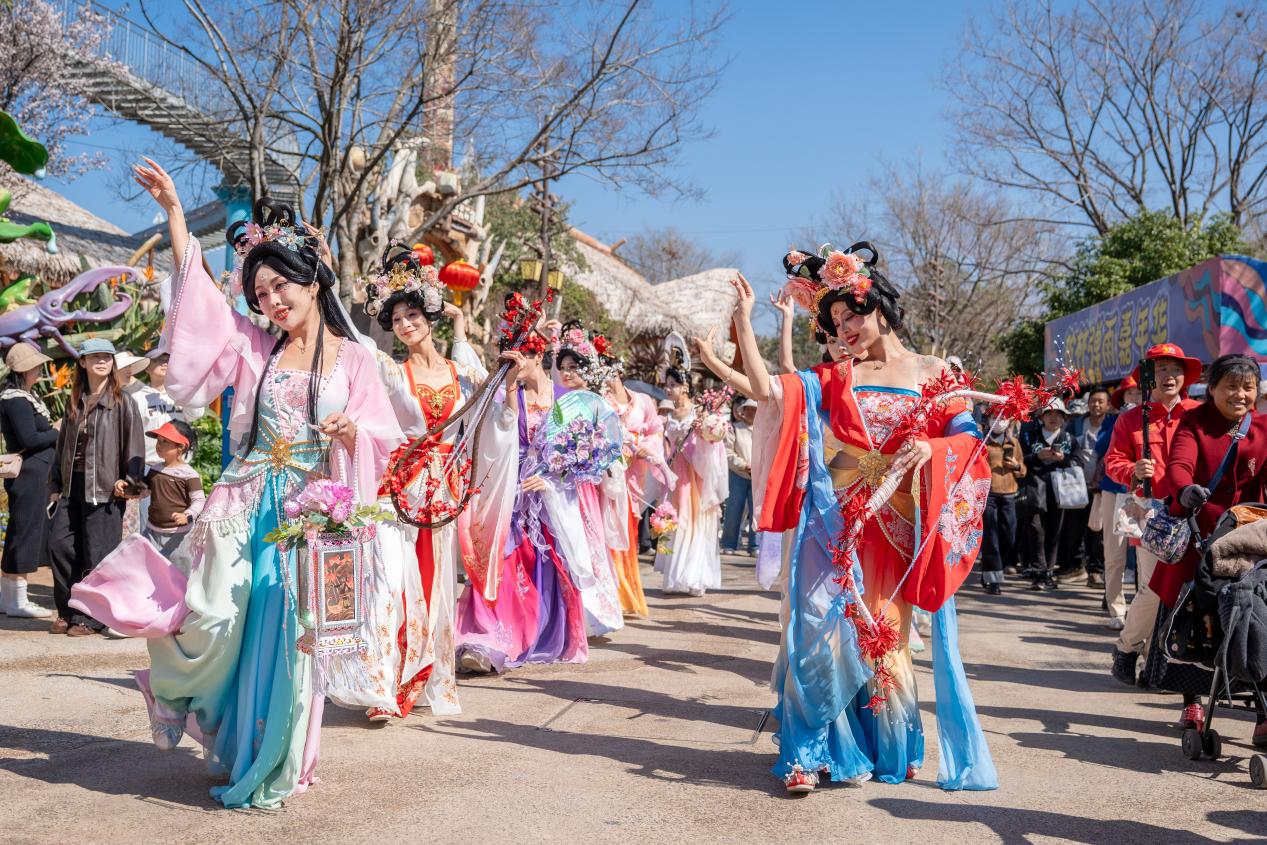 园区洪荒秘境广场处的《花神迎春》,则是一场唯美浪漫的视觉盛宴。十二位身着汉服的“花神”依时令次第登场,手持象征春意的花卉,伴随琵琶、笛箫等乐器,缓步巡游。她们轻舞飞扬,传递“花开富贵、春满人间”的美好祝愿,为新春增添一抹诗意与雅致。
