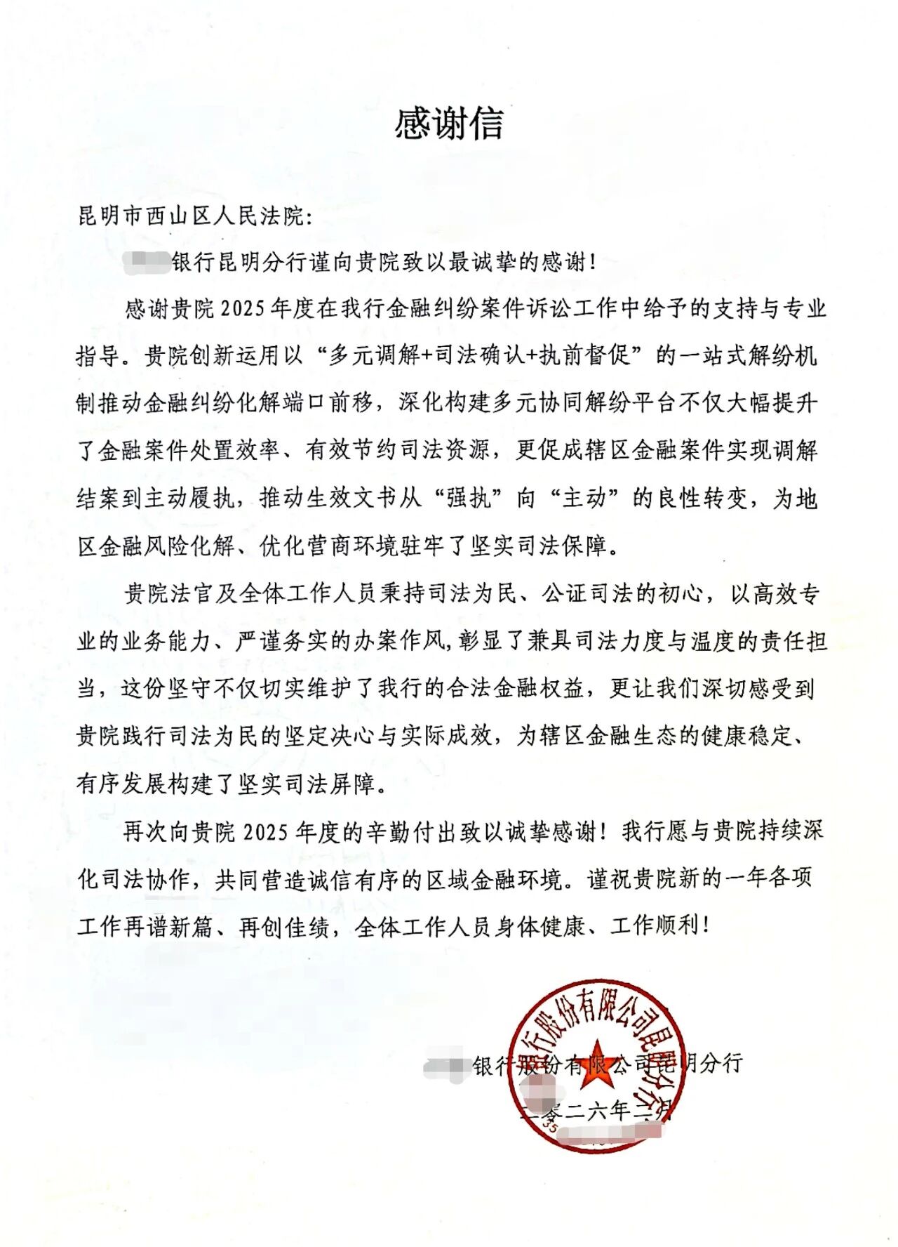 “神骏报春,吉启新程。”乙巳岁暮、丙午新春交替之际,昆明市西山区人民法院连续收到来自多家银行的感谢信和锦旗。信中,各家银行对西山法院高效便捷的金融审判工作表示感谢,点赞法院为金融机构高质量合规发展提供了坚实法治保障。