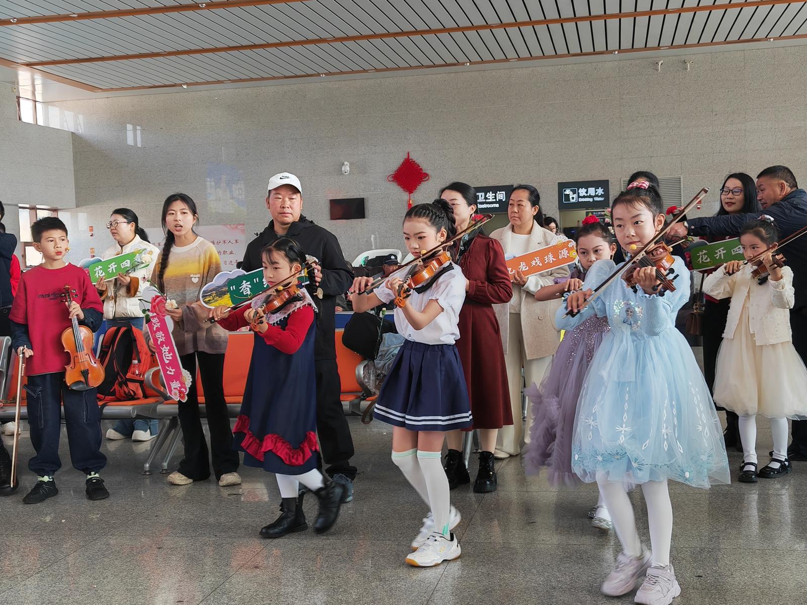 当《我和我的祖国》的悠扬旋律响起,高潮瞬间到来。小提琴家缓步走进人群,一群天真烂漫的孩童拉着小提琴簇拥而上,歌手们迅速汇聚,共同奏响这首充满力量的乐章。现场工作人员同步为旅客发放红旗与手牌,一时间,候车厅内红旗招展,歌声嘹亮。人们停下脚步,举起手机记录瞬间,有人轻声跟唱,有人眼泛泪光,在温暖的爱国情怀中共同感受伟大祖国的欣欣向荣,满怀满满的民族自豪感。