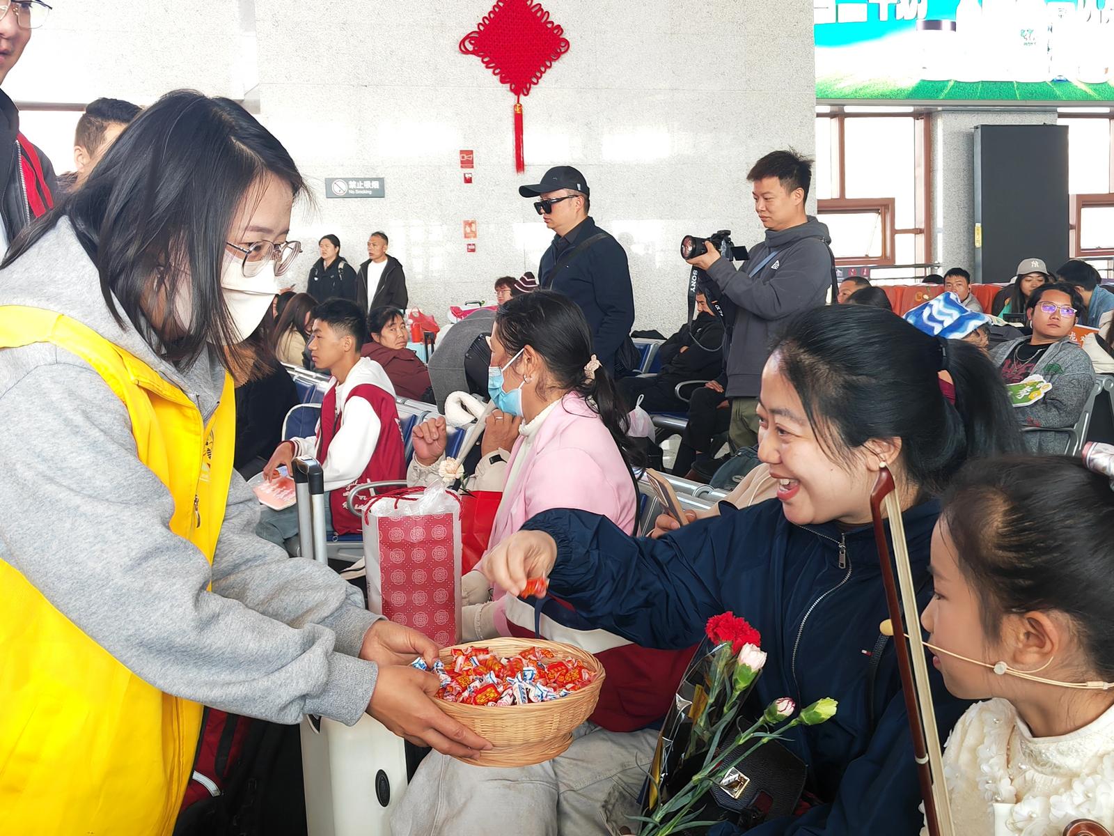 在候车厅中央,记者遇到了拖着行李箱的旅客彭馨梅及其同伴。她们刚从马龙老家过完元宵节,即将乘坐高铁前往江苏昆山务工。“再回来就是明年了,不过今天的活动太温暖了。”彭馨梅笑着掏出手机,展示刚发布的朋友圈:“心里暖暖的”。短短几行字,是被看见、被祝福的感动,也是曲靖这座城市送给远方游子的暖心行囊。