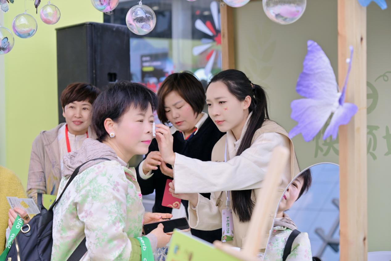市集深处,“春日焕颜坊”围满了人。轻美妆体验区,化妆师正在为一位女士打造春日元气妆。刚做完头皮按摩的王阿姨满意地摸了摸头发:“女儿拉我来的,说今天是三八节,得好好宠自己。没想到这个按摩还真舒服,店员还教我怎么春季养发。”