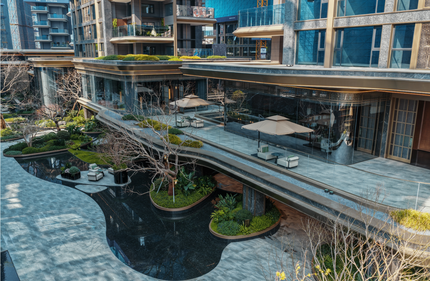 会所泳池的落地窗前,游泳的人可以听着叠水瀑布声;茶室的榻榻米上,煮茶的人可以看着云朵发呆;儿童游乐区的色彩明亮却不刺眼,是南昭壁画里提取的朱红与赭石。