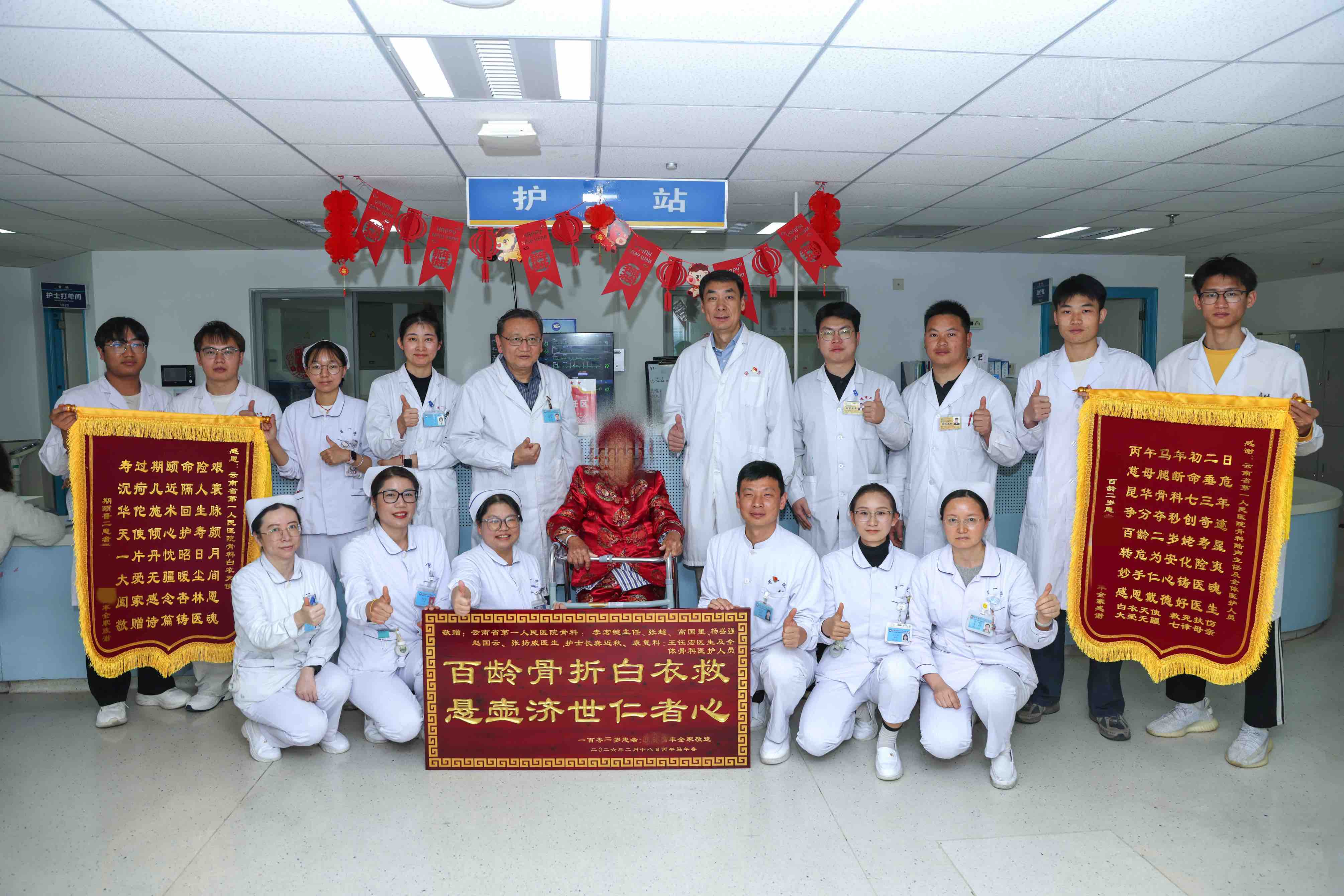 2026年3月3日,一位意外跌倒后接受紧急手术的101岁高龄老人,在云南省第一人民医院(以下简称省一院)骨科医护团队的精心救治与悉心照护下顺利康复出院。家属满怀感激之情,专程为科室送上两面锦旗、一块牌匾及一封感谢信,以此向全体医护人员的精湛医术和暖心服务致以最诚挚的谢意。