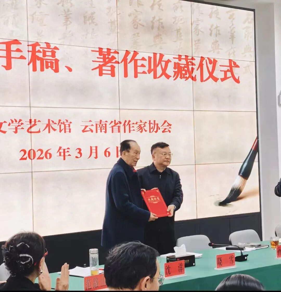 下午的捐赠仪式将这一天的“文艺温度”推向高潮。当91岁高龄的晓雪先生在众人搀扶下缓缓步入云南文学艺术馆时,在场者无不肃然起敬。这位从苍山洱海间走出的白族诗人,将自己珍藏数十年的一批珍贵资料郑重交予馆方:个人著作及珍藏图书294册、手稿10篇、照片12帧、书法作品4幅、美术作品1幅。