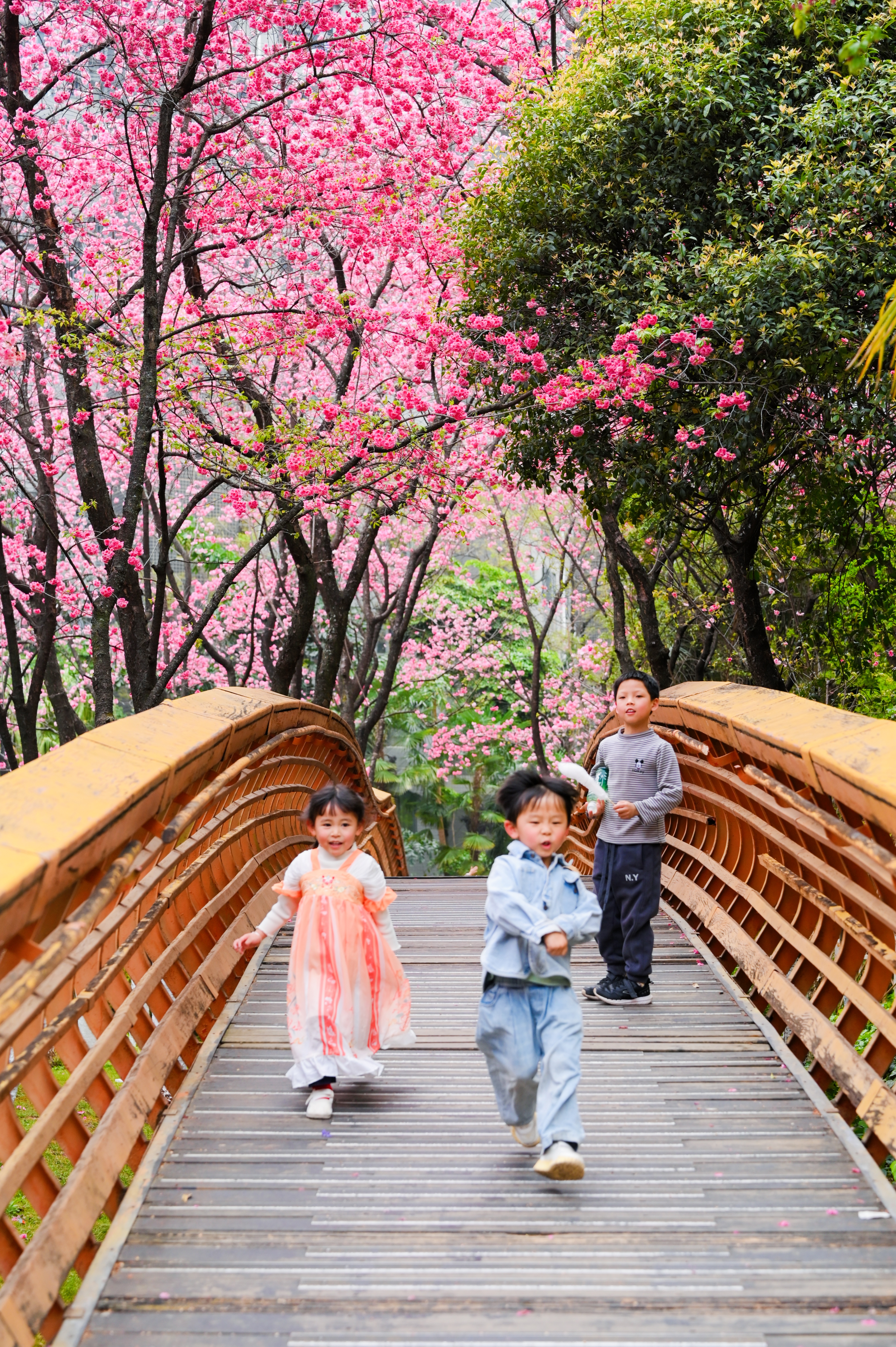 日前,开屏新闻记者步入樱花语园区,只见百余株樱花次第盛放,粉白相间,如云似霞,春风拂过,花瓣轻舞飞扬,铺就一条浪漫花径,勾勒出春城独有的浪漫景致。红色彩虹桥缠绕着细碎花影,与粉色樱花相映成趣,成为园区最佳拍照打卡点。杜鹃花与樱花竞相绽放,姹紫嫣红间藏着中式园林的雅致,一步一景,步步皆诗。繁花之下,是热闹非常的游园乐事,樱花市集、互动游戏,欢声笑语不绝于耳。无论是漫步赏樱、拍照留念,还是静坐闻香、闲话家常,都能在沁人花香中,感受自然之美、生活暖意与邻里温情。