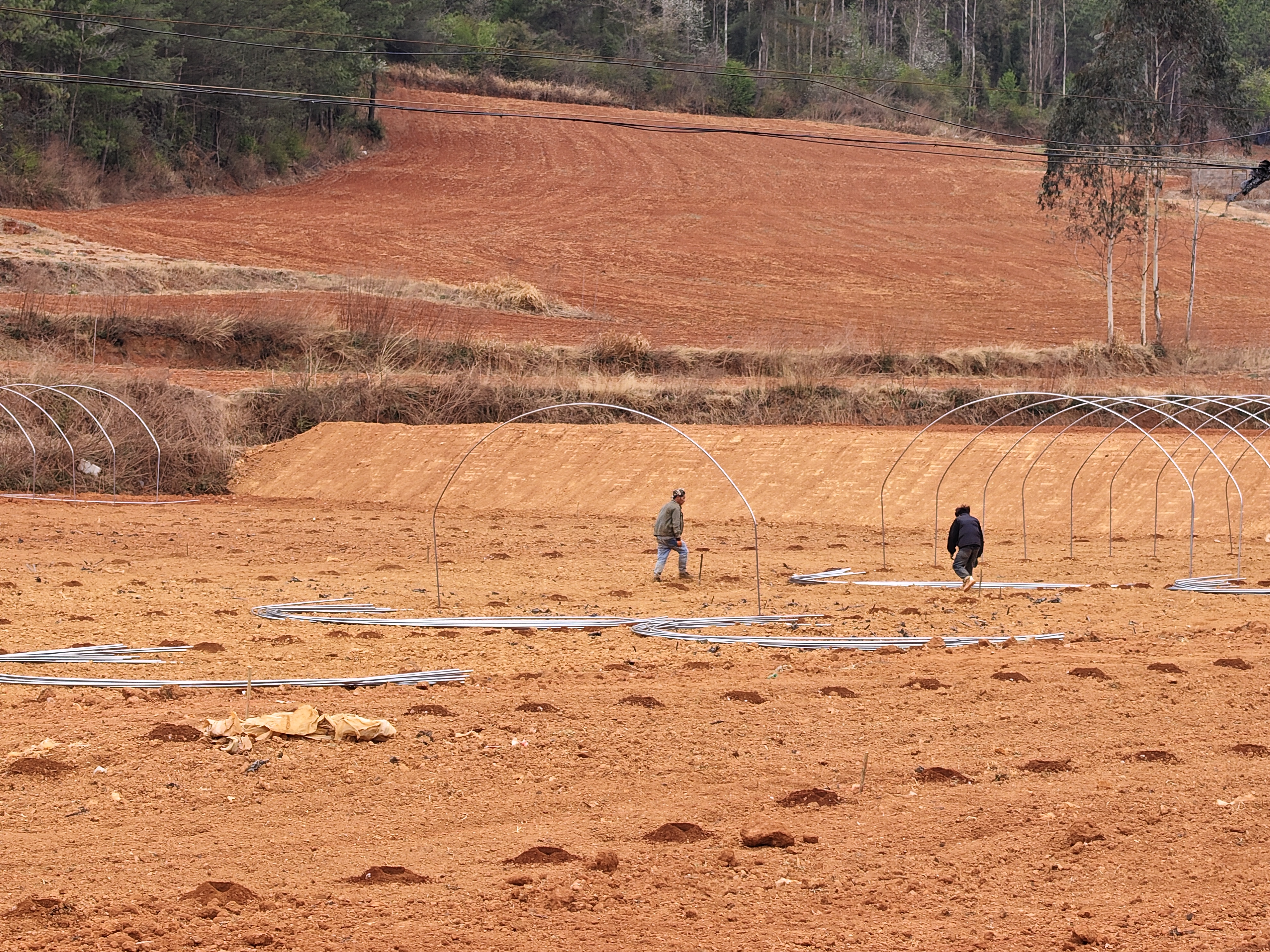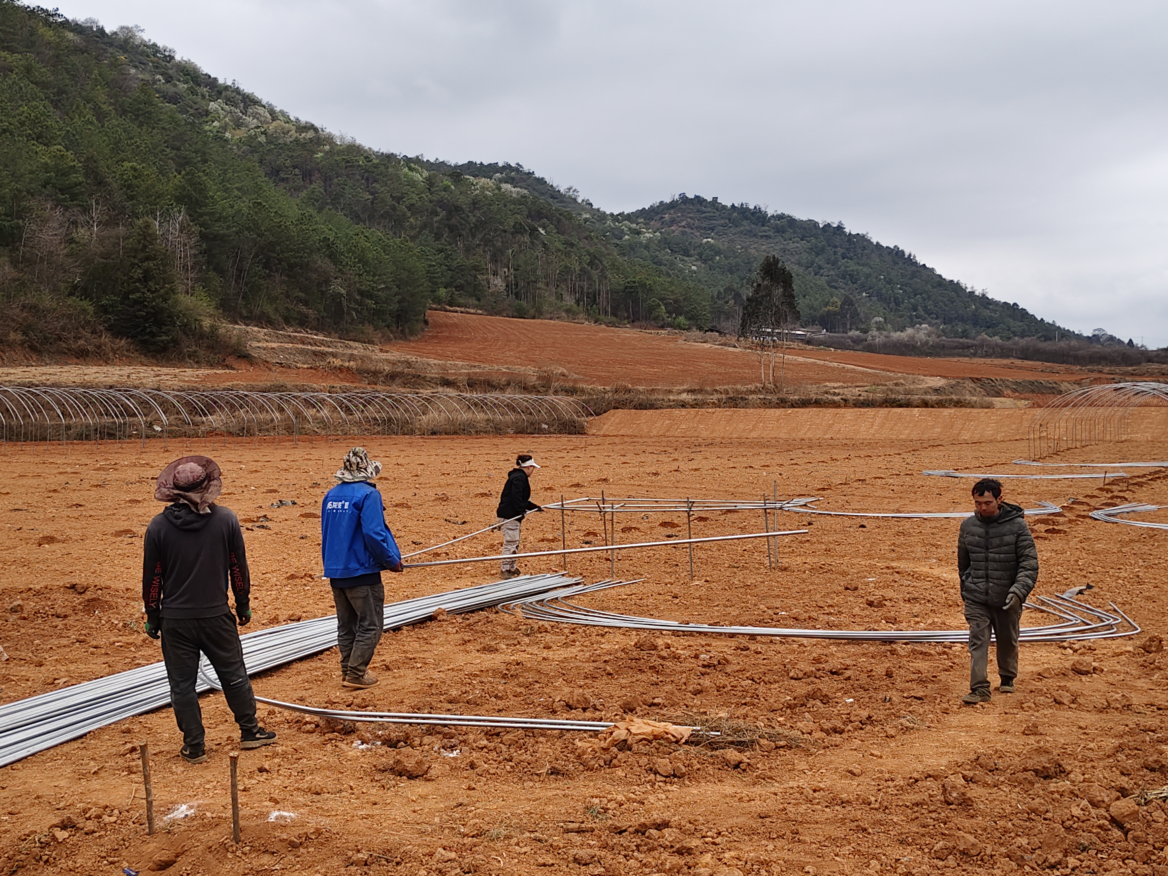 近日,玉溪市易门县睿恒农业高原特色蔬菜种植基地建设稳步推进。基地建设现场一派热火朝天、机械轰鸣的繁忙景象。工人们分工协作、紧张作业,抢抓春日晴好天气加快推进大棚钢架搭建,一座座现代化蔬菜大棚已初具雏形。