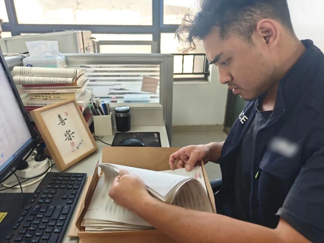 2023年,王根有递交了入党申请书,如今已成为入党积极分子。他说:“党员身份意味着可以更好地帮助别人,戴着党员徽章,思想上就不一样了,更有干劲。”工作之外,王根有喜欢写毛笔字,他在自己桌上写了两个字:“喜乐。”