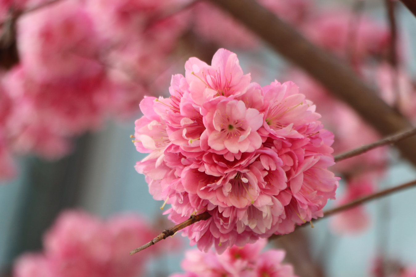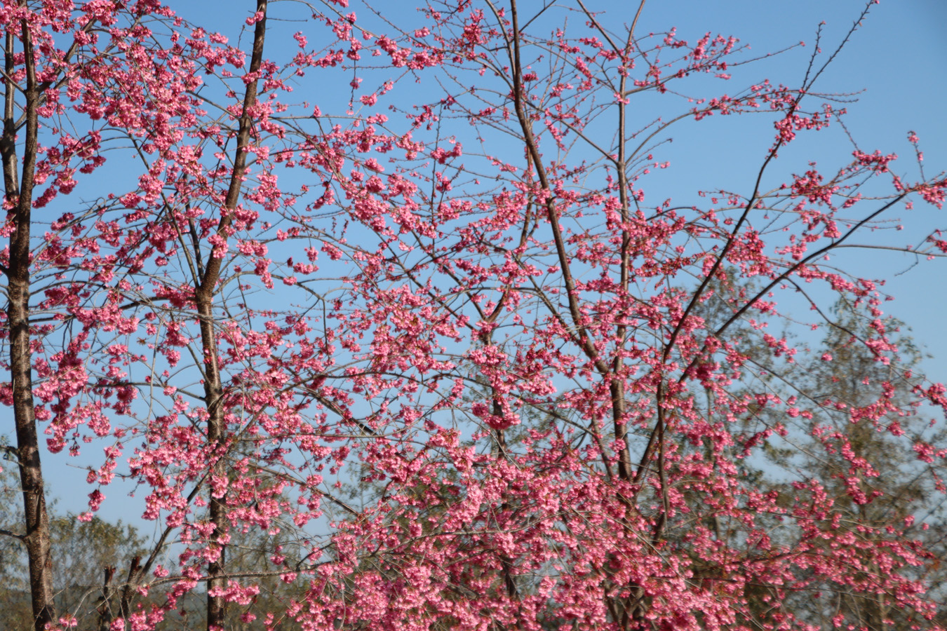 起初是零零星星的一两棵,立在农家院落边,像害羞的姑娘探出墙头;越往山里走,樱花越多,公路两旁、山坡之上、房前屋后,那一树树粉红,如霞似火,铺天盖地地闯进眼帘。