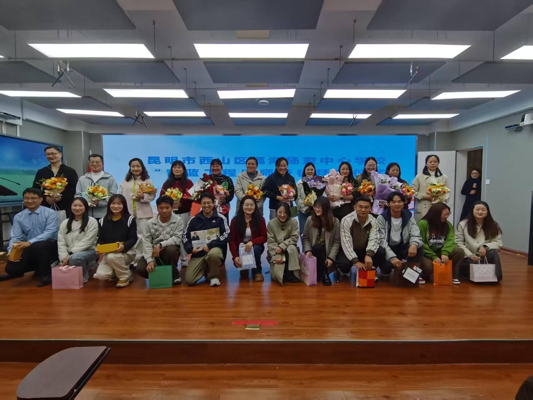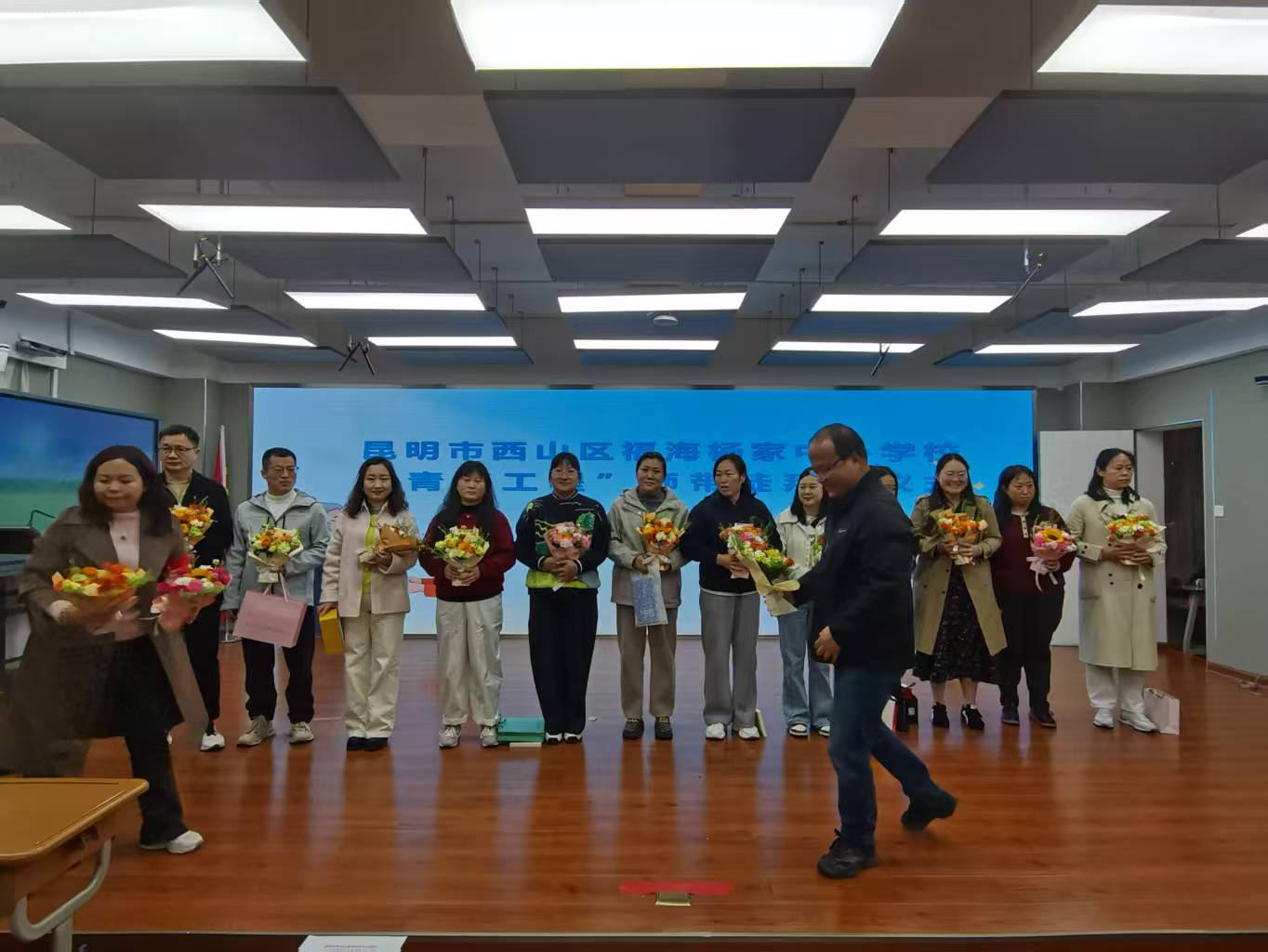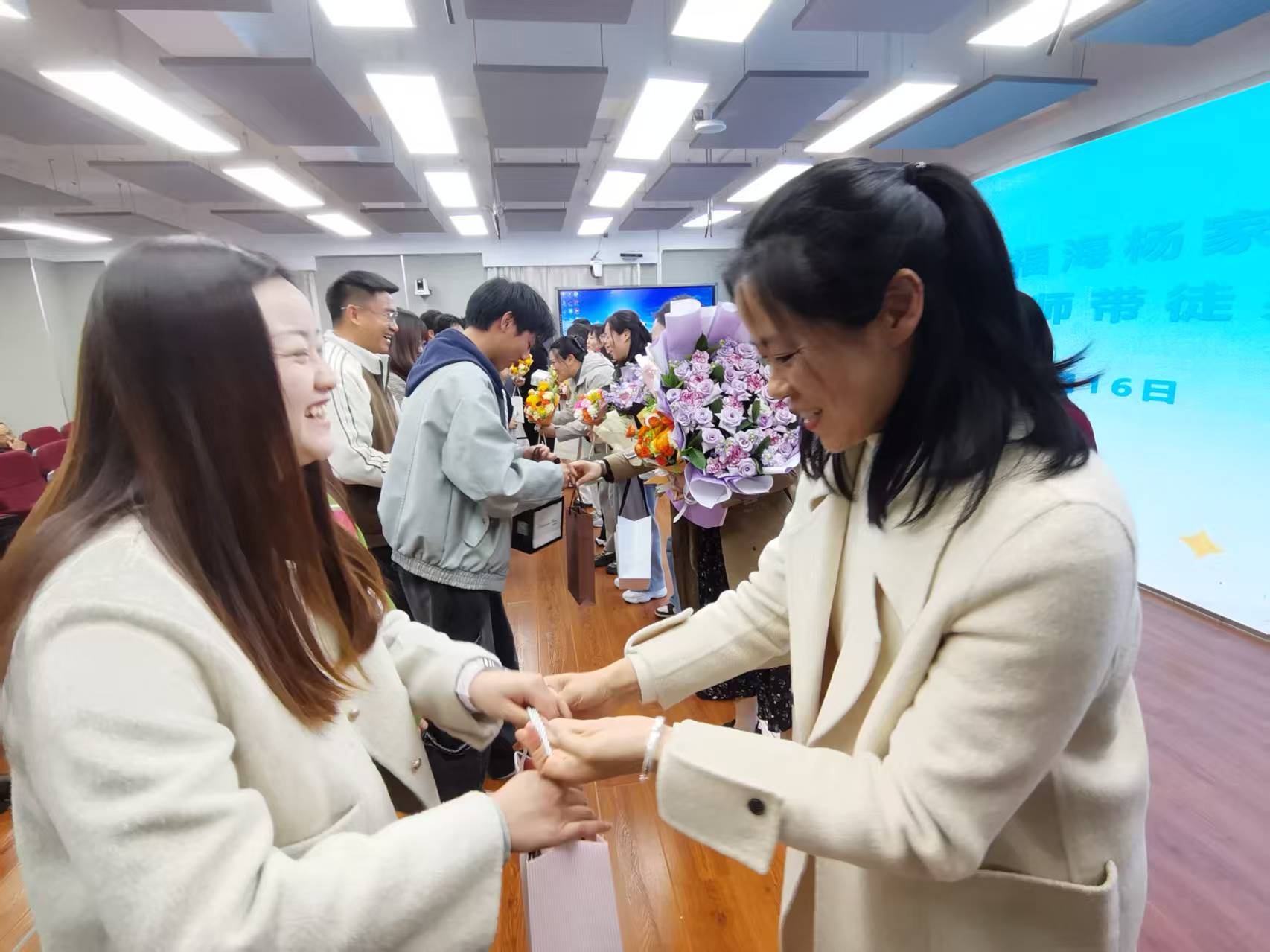 仪式在庄重而温馨的氛围中拉开帷幕。学校领导首先向担任师父的12位教师献上鲜花,以此表达学校对他们勇于担当、乐于奉献的诚挚敬意与感谢。一束束芬芳的鲜花,不仅承载着荣誉,更寄寓着沉甸甸的责任与期望。