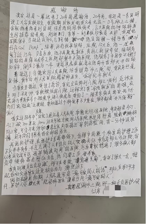 近日,昆明市第三人民医院肝病一科收到一封特殊的感谢信,字里行间承载着患者张先生跨越20年、延续两代人的深厚信任,诉说着一段温暖动人的医患故事。