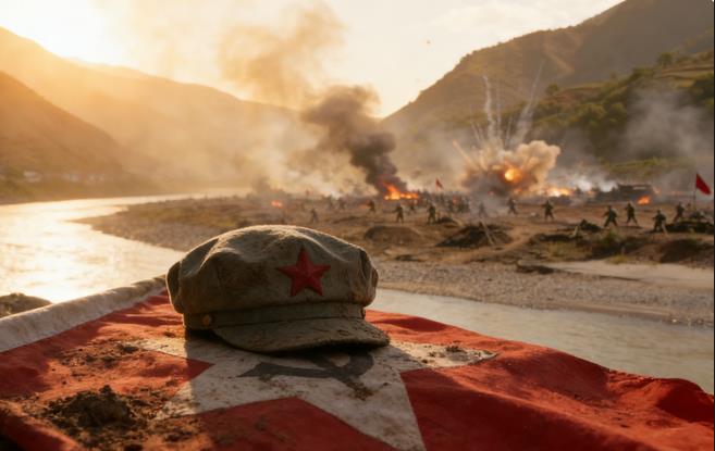 《一顶红军帽》设定在1935年至1936年,红军指挥员萧令彬率部奉命抢占禄劝翠华普渡河,牵制敌军,保障中央纵队顺利渡过金沙江北上抗日。面对铁索桥沿岸密布的铁丝网、被拆毁的桥面木板以及敌军制高点的火力封锁,萧令彬果断决策,组织突击队从下游浅水处涉水迂回包抄。战场上,他与军团女军医、妻子秀云相见,夫妻二人深知此战凶险,却相互支持、深情告别。秀云为萧令彬系上红围巾、整理军帽,二人互致军礼后,萧令彬便率队冲向战场。最终,突击队圆满完成战斗任务,但萧令彬在激战中壮烈牺牲。