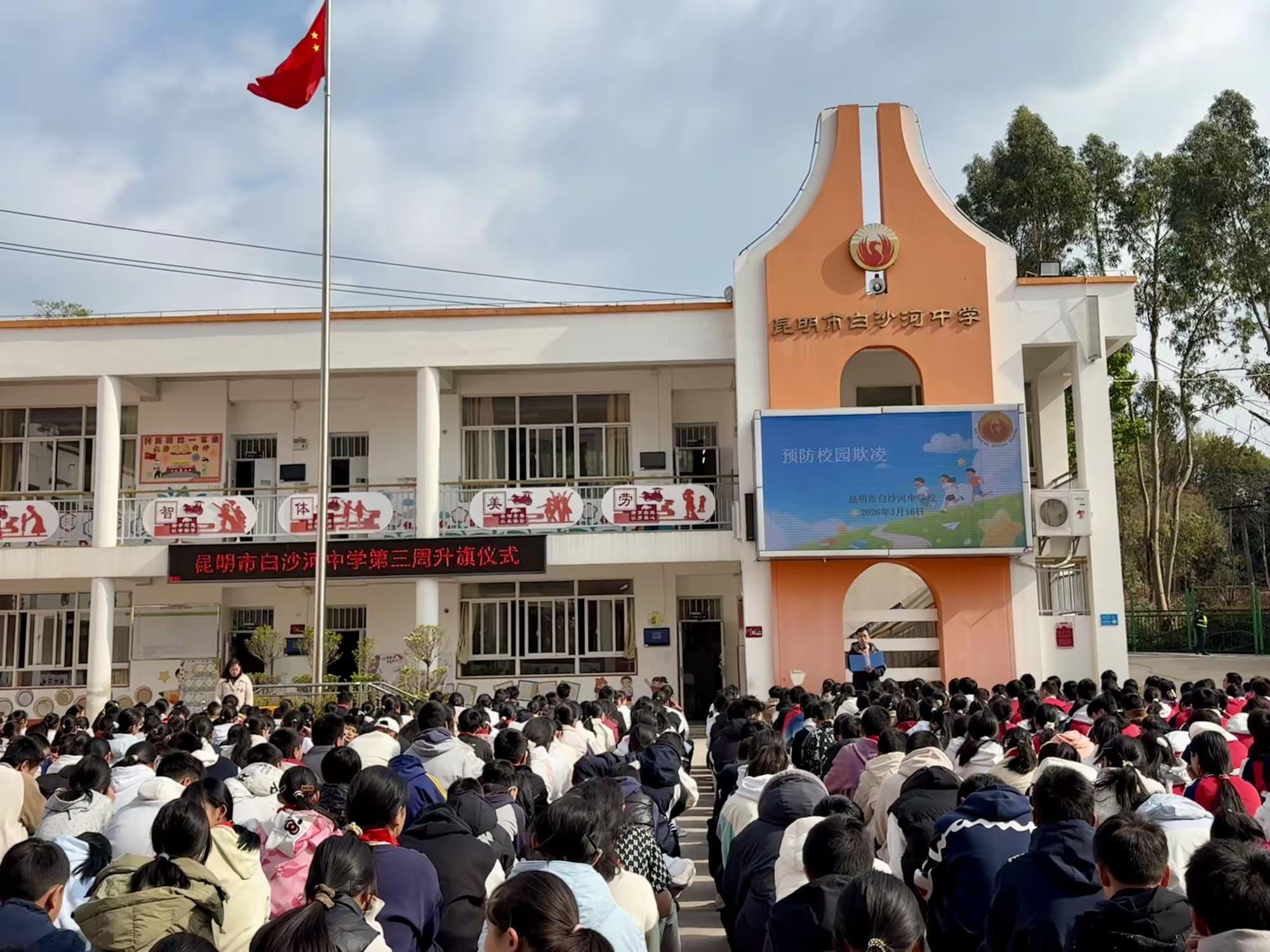 为切实筑牢校园安全防线,全方位守护学生身心健康,全力营造和谐友善、文明有序的校园育人环境,3月16日,昆明市白沙河中学校围绕“预防校园欺凌”核心主题,精心组织开展系列专题宣传教育活动,通过国旗下讲话、专题知识讲解等多元形式,为全校学生普及校园欺凌防控知识,传授科学应对方法与相关法律常识,筑牢青春安全防护网。