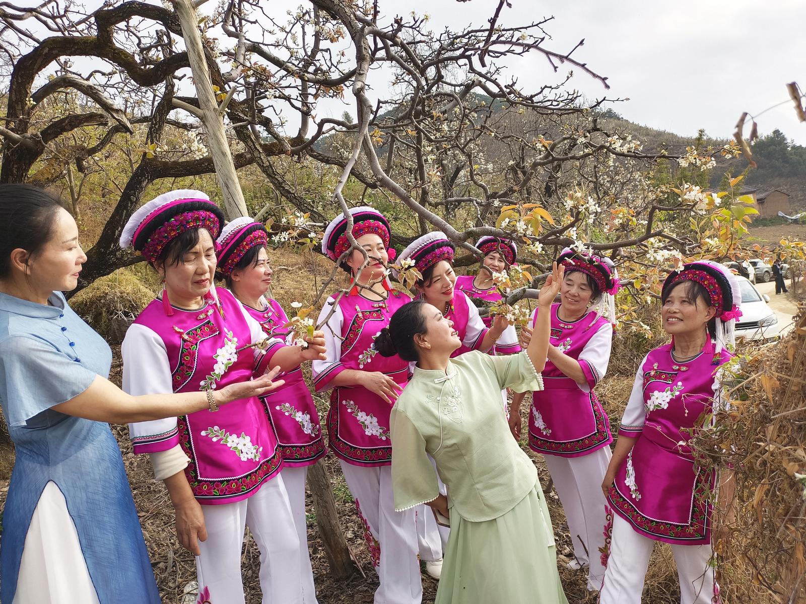 “这漫天的洁白,是云,是雾,是雪,更是诗”,“它开在诗词里,开在春风里,开在我们心底最柔软的地方”,“不染半分尘埃,自带一身清雅”……在赏花活动现场,朗读者们聚在梨树下,以深情的语调、真挚的情感,深情朗诵了《梨花如雪 岁月清欢》《情满三转湾 香醉梨花园》《梨花与春天》和《春之颂》4首诗,将梨花的清雅、春天的生机娓娓道来。女声独唱《花开中国》、电吹管伴唱《我是一条小河》与舞蹈《梨雪宴舞》穿插其间。唢呐独奏《中国喜洋洋》、二胡独奏《埂子调》与原生态民歌《一树春雪一山谣》将现场的氛围推向新的高潮。在梨花纷飞的背景下,歌声与舞姿交织,微风过处,花瓣簌簌落在肩头,落在舞者旋转的裙摆间。优美的诗句、灵动的歌舞与眼前如雪的梨花相映成画,让现场观众在领略文字之美的同时,更沉浸于春日梨园的浪漫景致。不少游客驻足聆听、拍照留念,定格这份独属于三转湾的春之韵味。