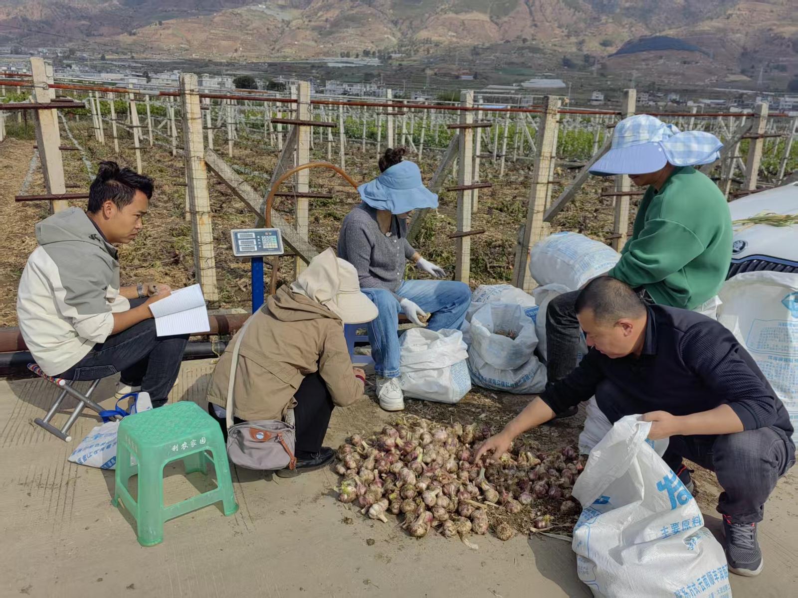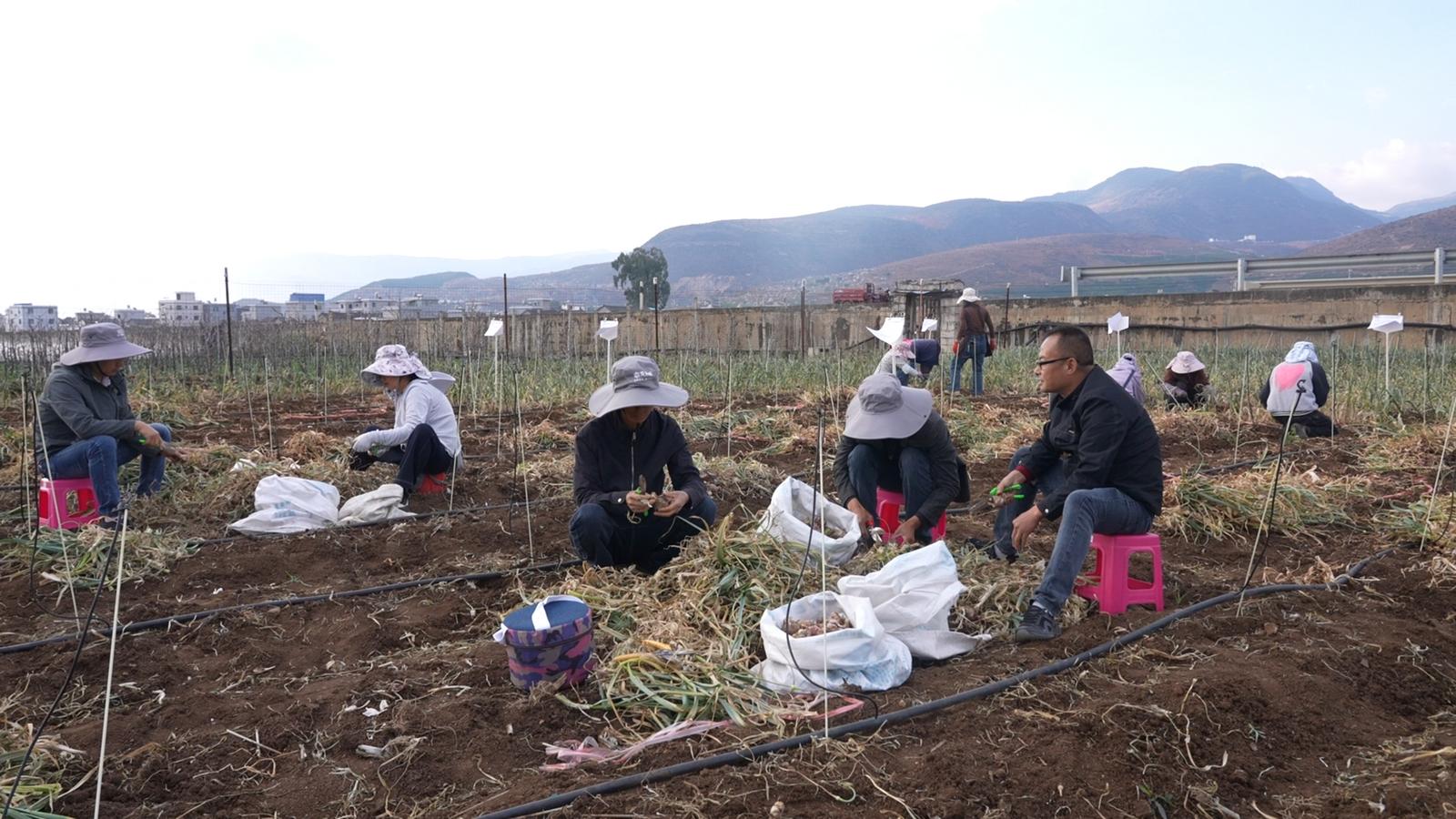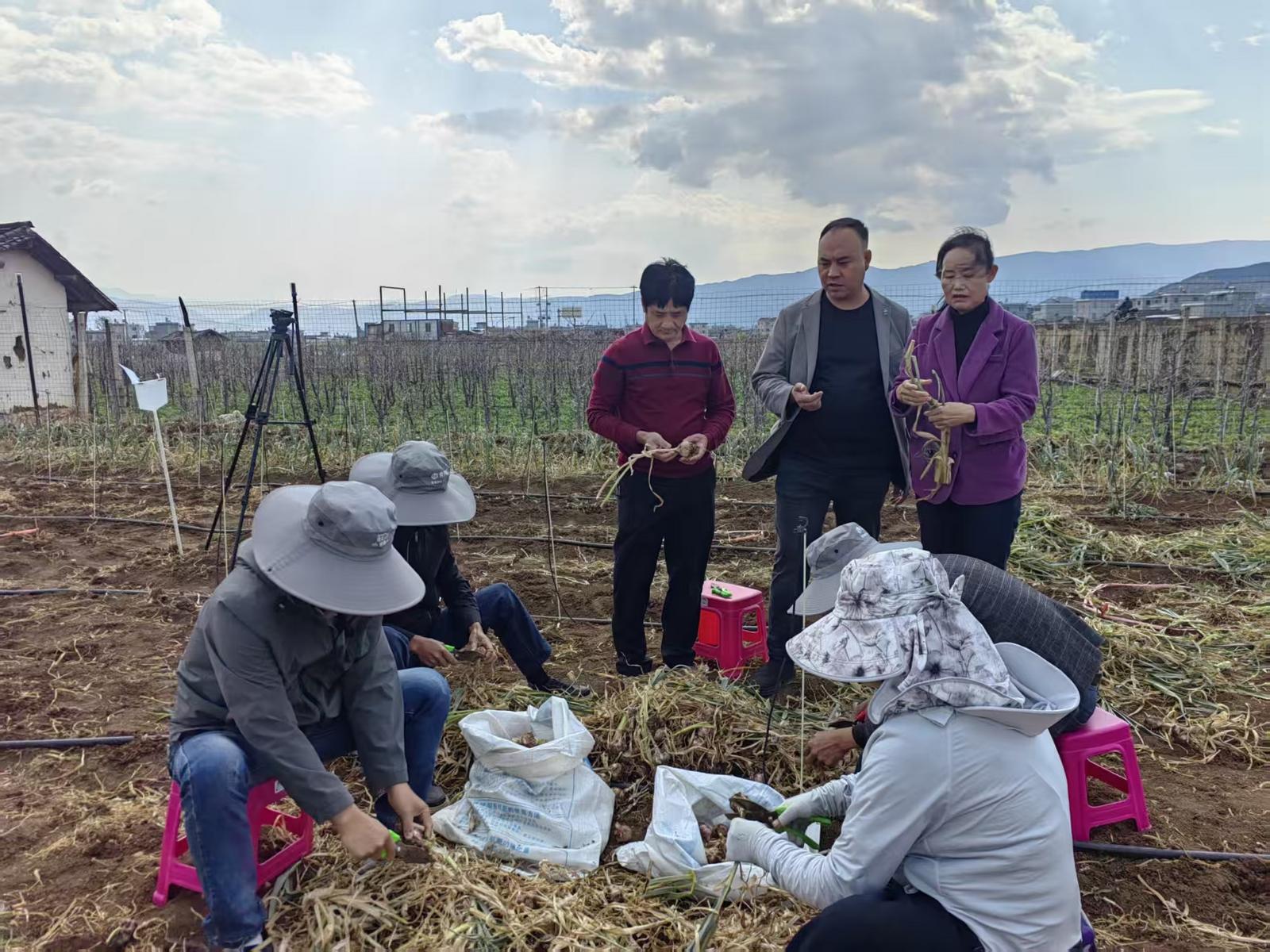 近日,在大理州宾川县宾居镇大蒜白腐病防治试验示范基地,农技人员和农户们分工协作,对大蒜进行采收、测产及防治效果调查。