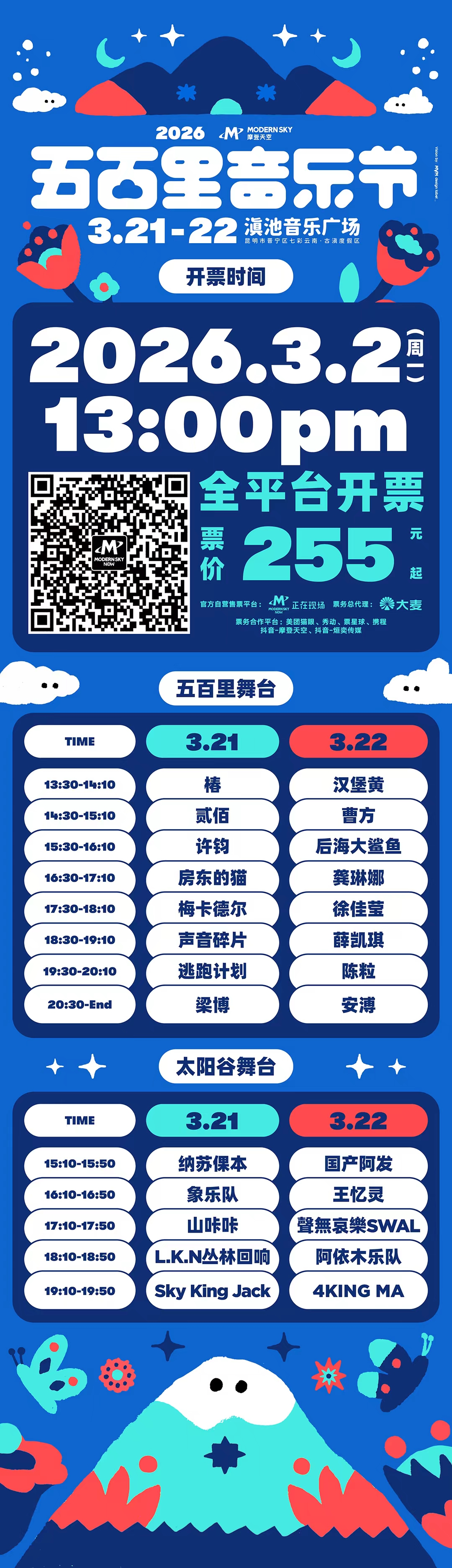 本周末(3月21日至22日),2026五百里音乐节将在昆明七彩云南·古滇度假区滇池音乐广场启幕。截至发稿,两日通票及21日单日票已全部售罄,仅剩少量22日全价单日票。这场诞生于昆明的音乐节“明珠”,用十四年时间完成了从本土音乐盛宴到全国知名文旅IP的蜕变,而贯穿其中的,是对云南在地文化始终如一的深耕与传播。