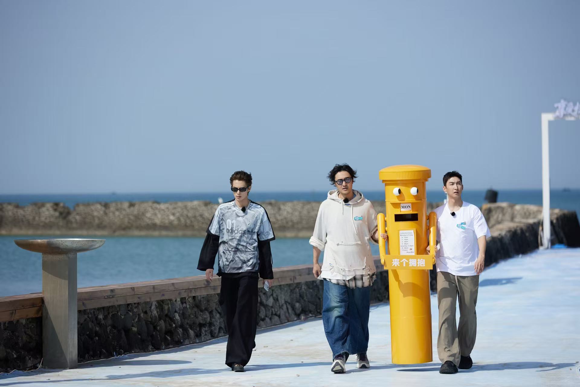 不过,兄弟情归兄弟情,活还是得毫不含糊地干。刚夸完两人的厨艺,王鹤棣就掏出义工徽章,安排起任务:收拾厨房、摆果盘、扔垃圾、布置打卡点……三人把王传君带来的“来个拥抱”打卡邮筒,合力挪到海边最佳位置,梦回“桃花坞”中“三傻”同框名场面。转战厨房后,三人也不忘打打闹闹,王鹤棣拿起莴笋假装打棒球,王传君和武大靖立刻配合入戏,宠溺的氛围蔓延整个厨房。最令人触动的瞬间,是皮划艇大赛结束后,两位哥哥让王鹤棣坐进小推车,拉着他返回客栈,途中还争着要背他。王鹤棣欢快叫着一声声“哥哥”,兄弟间的默契与温情溢于言表。