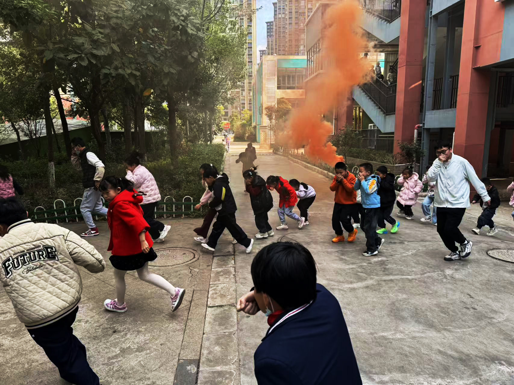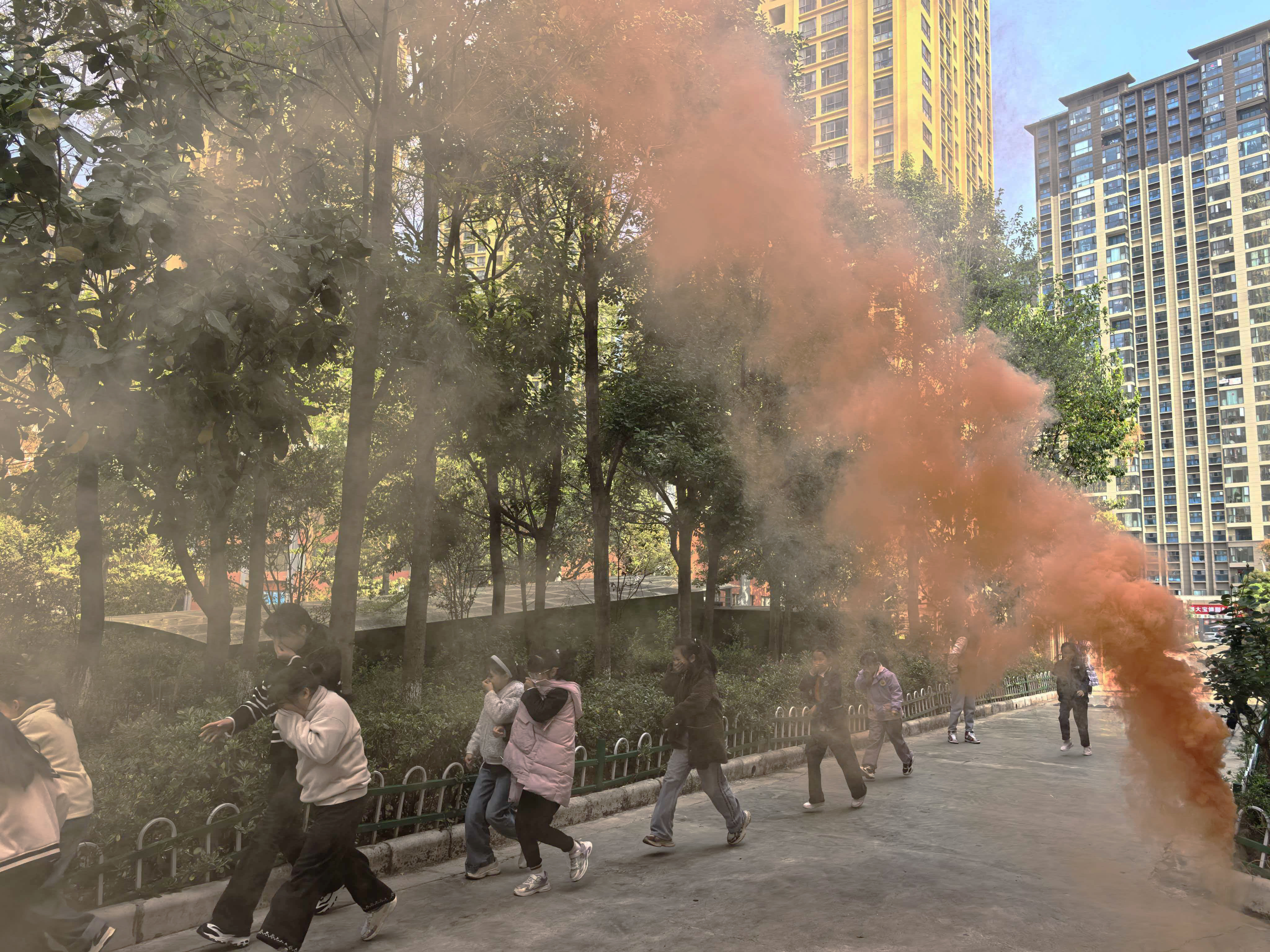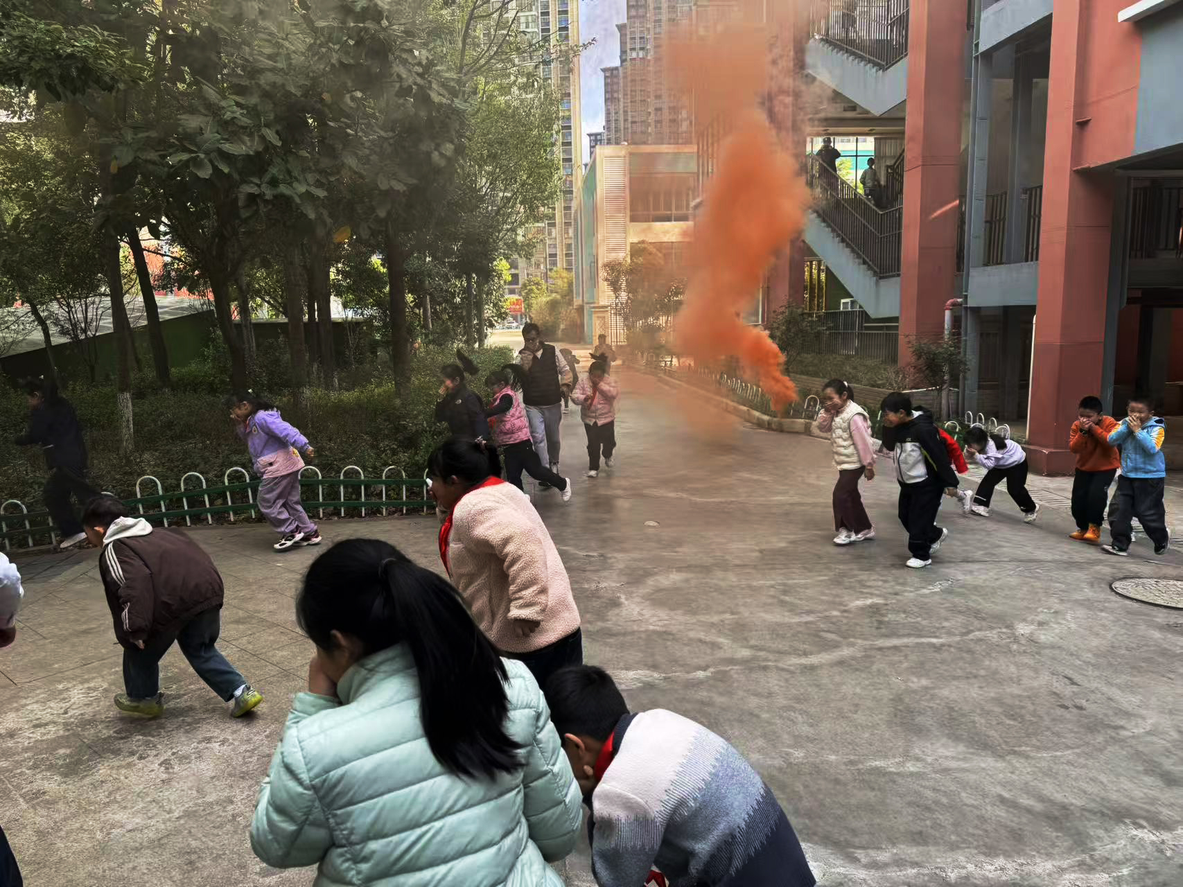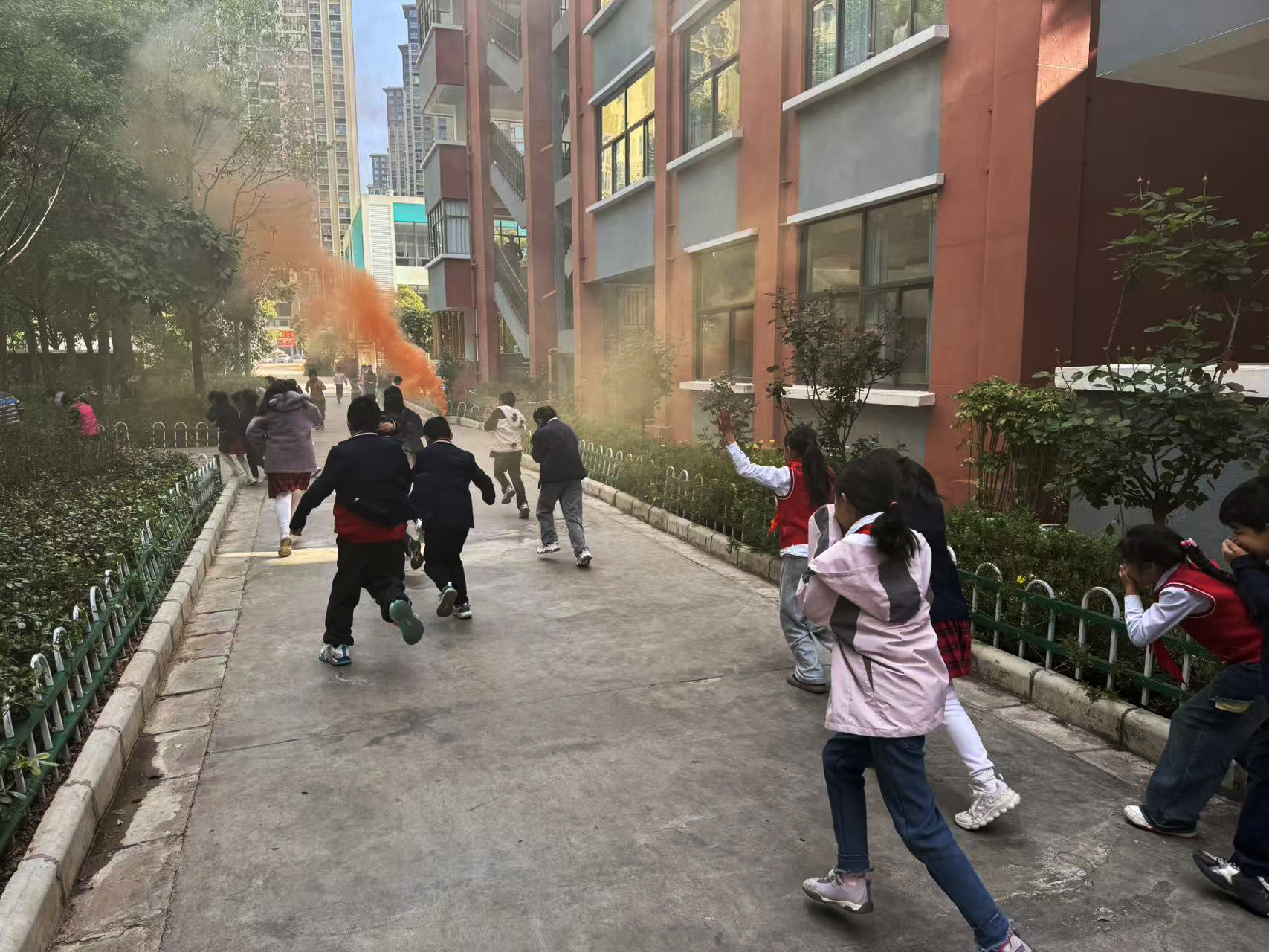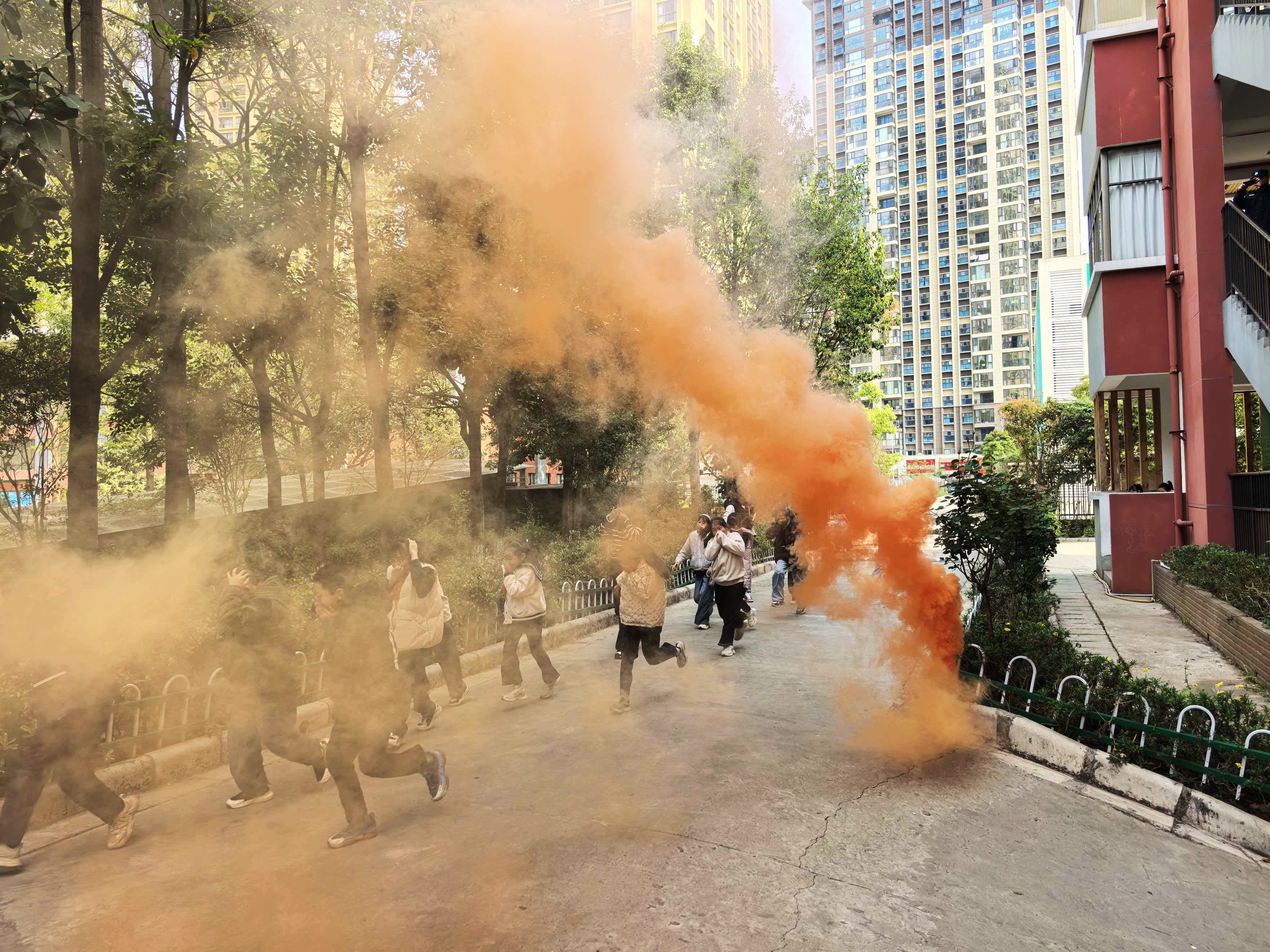 “呜—呜—呜……”3月17日上午10时,一阵急促的警报声突然划破校园的宁静,教学楼楼道瞬间弥漫起橙红色的模拟烟雾。这不是火灾现场,而是武成小学教育集团海源校区(海源小学)正在进行的“实战化”消防演练。逼真的烟雾和刺耳的警报,让全校师生瞬间进入“紧急状态”。