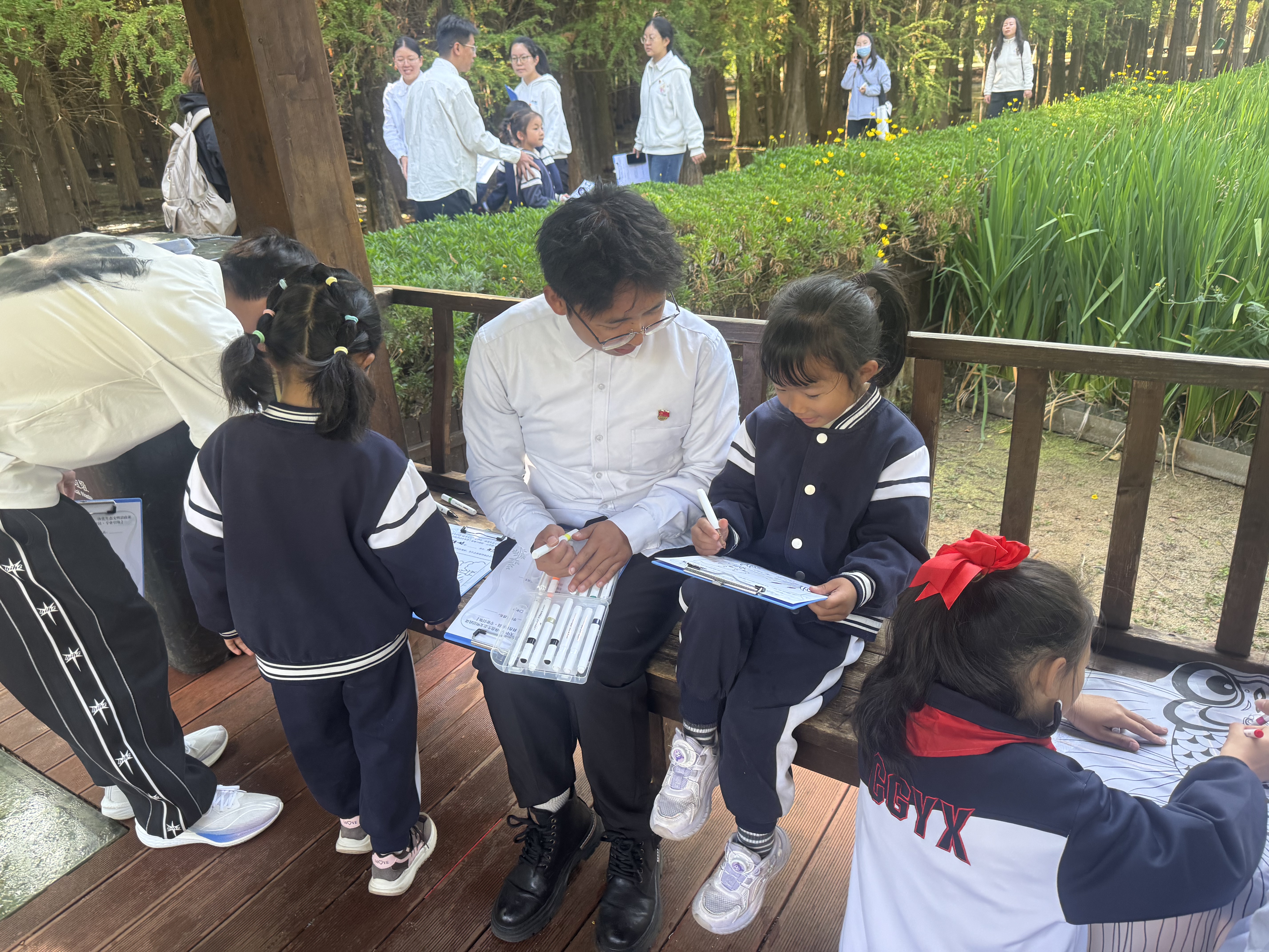 活动现场,云南师范大学学生党员带来生态思政微党课,呈贡一中团员宣读生态文明保护倡议书,“生态守护”主题旗帜在各学段间接力传递,传递信仰、责任与代代相传的生态担当。沉浸式实践环节中,各学段学生各展所长、各有所获:幼儿园萌娃亲近自然、触摸绿意;少先队员化身湿地小侦探,记录植物、书写自然笔记,厚植生态情怀;中学生开展水质与生物多样性调研,在探究中增强责任意识;大学生志愿者担任科普讲解员,以专业力量引领实践、服务现场。