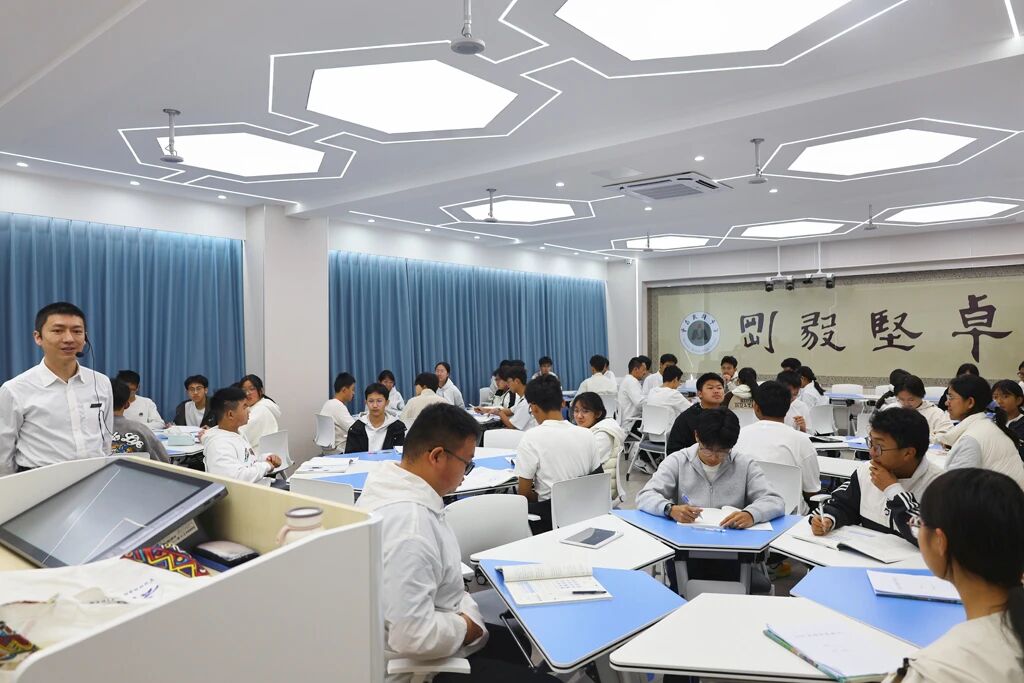 在录播教室,吕政恒老师展示生物课《孟德尔的豌豆杂交试验》。课堂依托AI动态视频与互动小游戏,将抽象的遗传规律直观化、趣味化,充分展现智慧教学与课堂创新的融合成果。代表团认真观摩、详细记录,对学校在教育数字化转型与课堂教学改革方面的实践成效频频赞许。