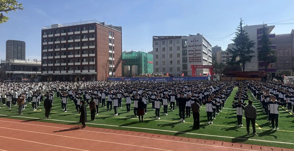 大课间活动中,民中学子队列整齐、朝气蓬勃,展现出昂扬向上的精神风貌。不同语言的问候与真诚的笑容交织,定格下跨文化交流的温暖瞬间。
