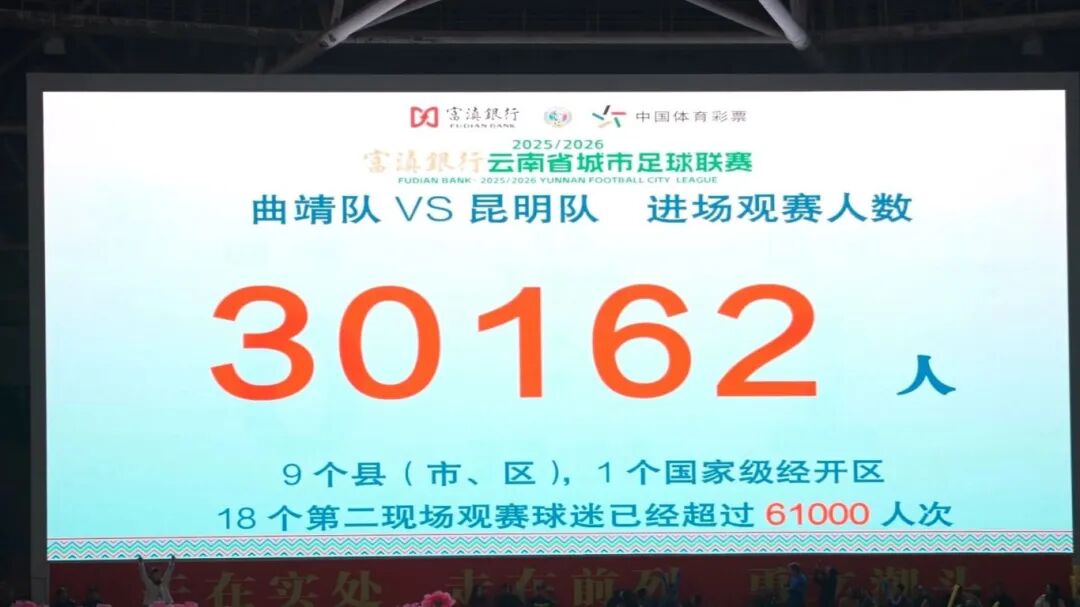 2025年12月,曲靖市球迷协会正式成立,在册会员突破3000人,实现了从零星散落到组织化助威的飞跃。滇超联赛期间,曲靖队主场多场比赛观赛人数超过2.5万人,其中“滇中德比”创下30162人的现场纪录,门票线上开售18小时内即告售罄。赛事期间推出的“票根经济”模式,联动百余家商户,实现了“看球+住宿+休闲+美食”的一站式体验。