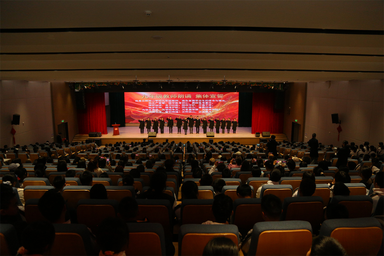 初三年级组长张雪带领九年级全体教师朗诵并宣誓。铿锵的誓言中,教师们表达了对教育初心的坚守和对学生的陪伴。