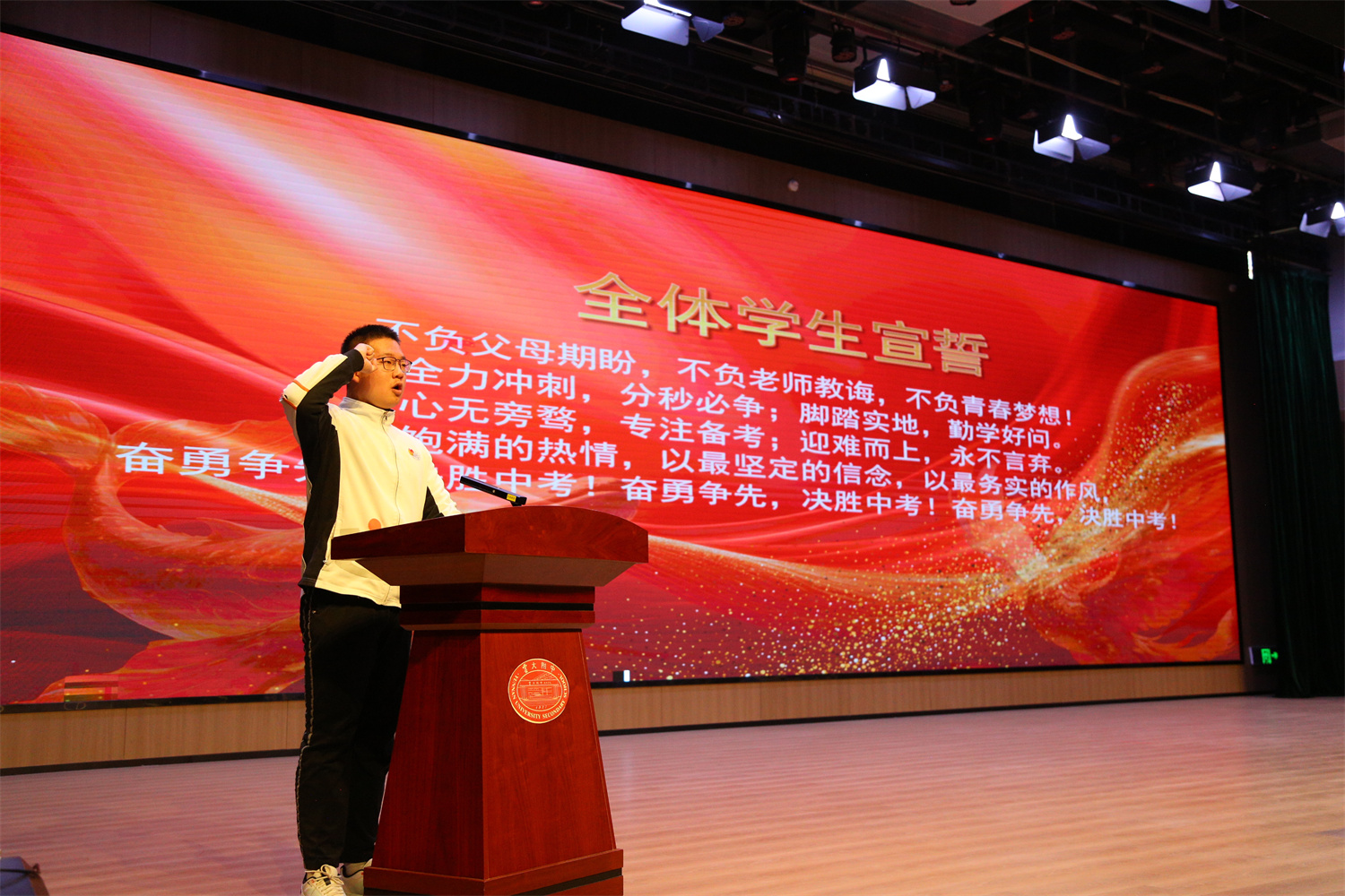 九年级学生代表李泰成随后登台发言,并带领八、九年级全体同学宣誓。“直面挑战、决胜考场”的誓言在操场回荡。