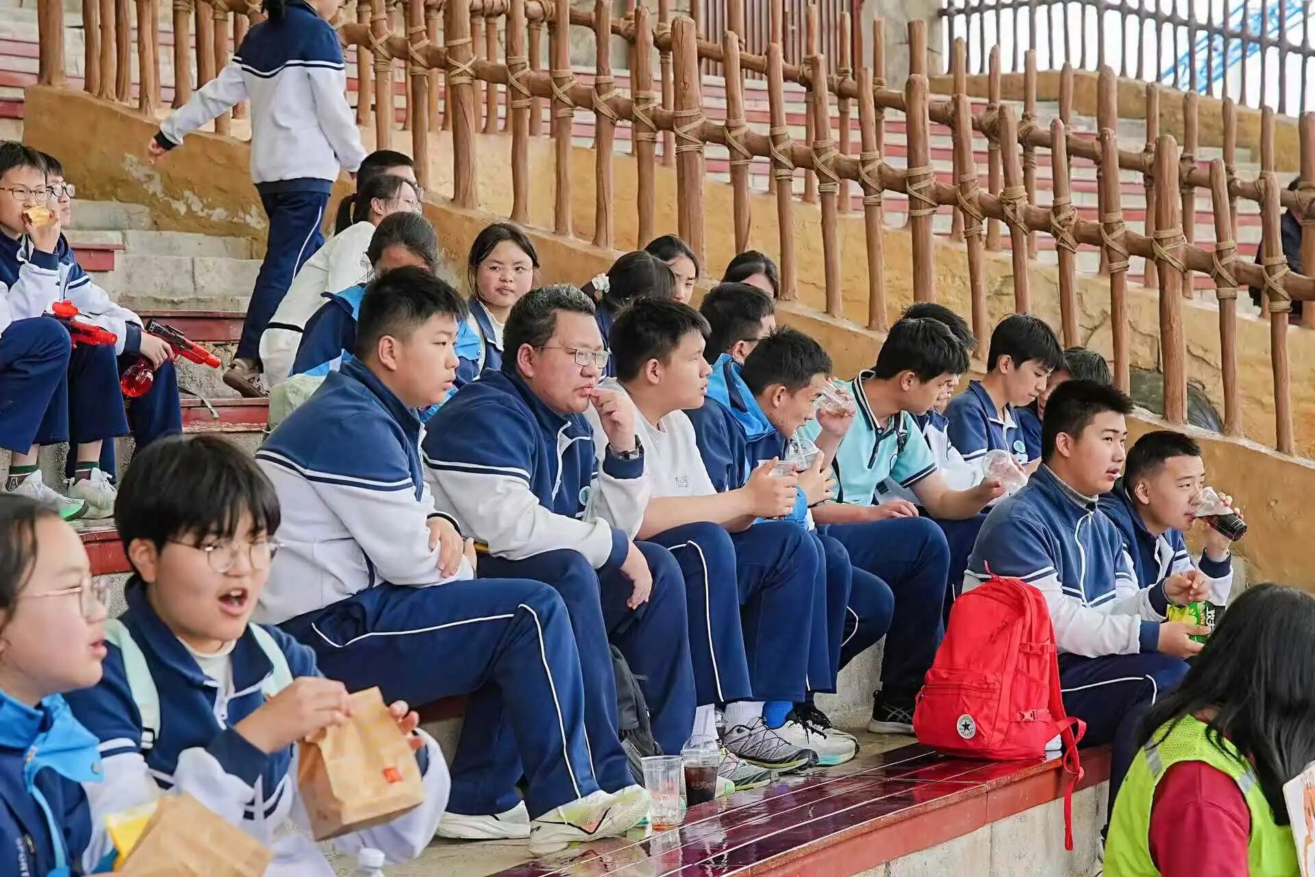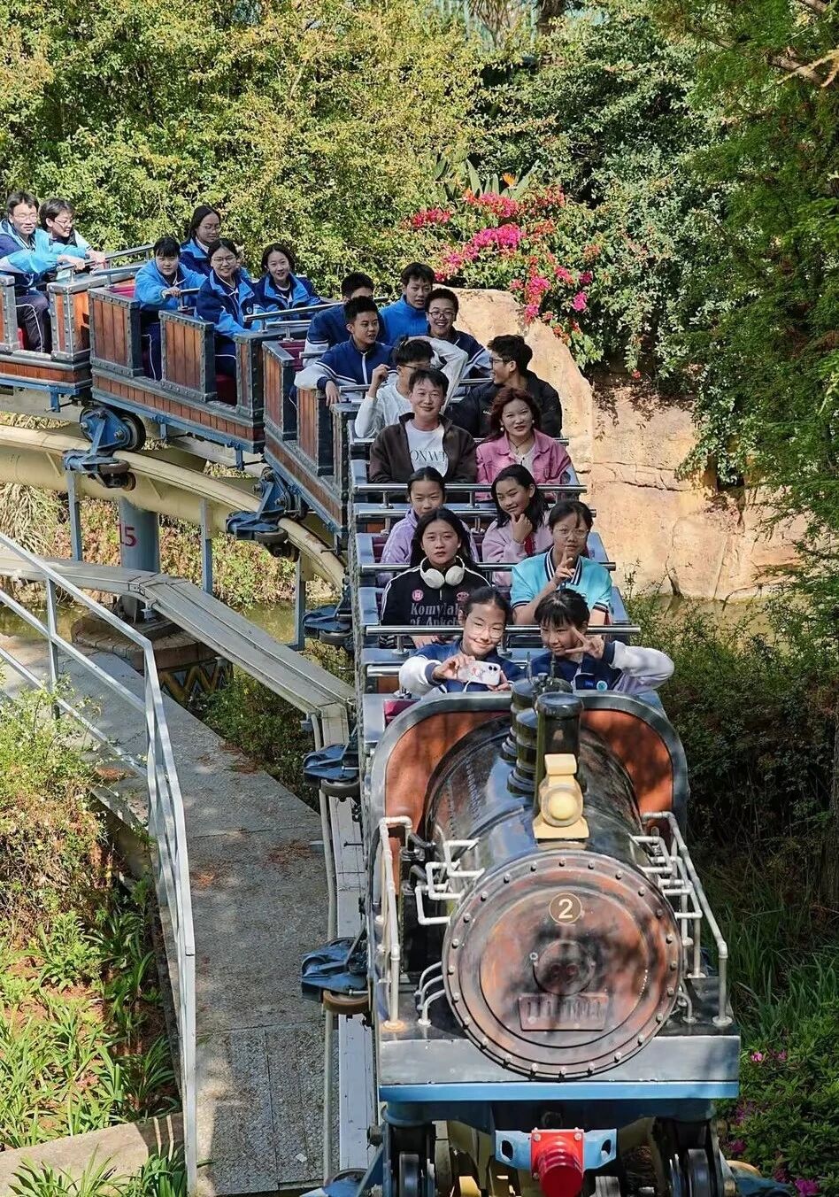 游玩间隙,师生们携手清理场地垃圾,以实际行动践行绿色环保理念;老师们全程陪伴左右,关注学生状态、提醒安全防护、定格欢乐瞬间,成为景区内最温暖的风景线。初一学子在项目挑战中突破自我,初二、高中年级师生则在互动交流中拉近距离,同窗情谊与师生温情在春日里悄然升温。