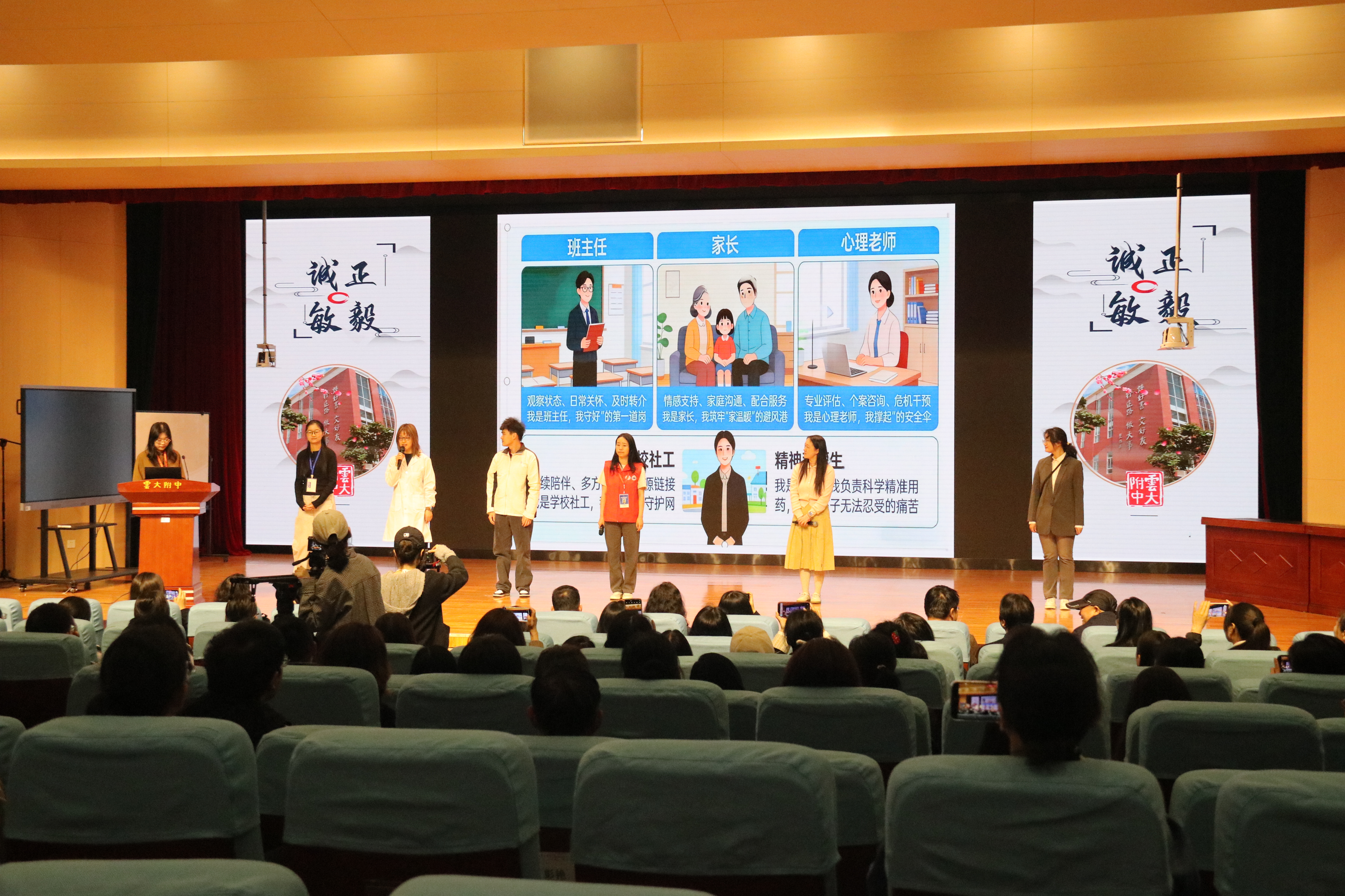 为了让现场嘉宾更直观地了解驻校社工的服务内容,云南大学社工师生团队还准备了视频与情景剧融合的展示环节。师生们通过生动演绎,呈现了学校社工在校园中的多元角色——串联家校社医各方资源、打通青少年成长服务链条,在日常中做好陪伴倾听、资源链接与关系疏导。精彩的展示让在场师生和家长对驻校社工有了更清晰的认识。