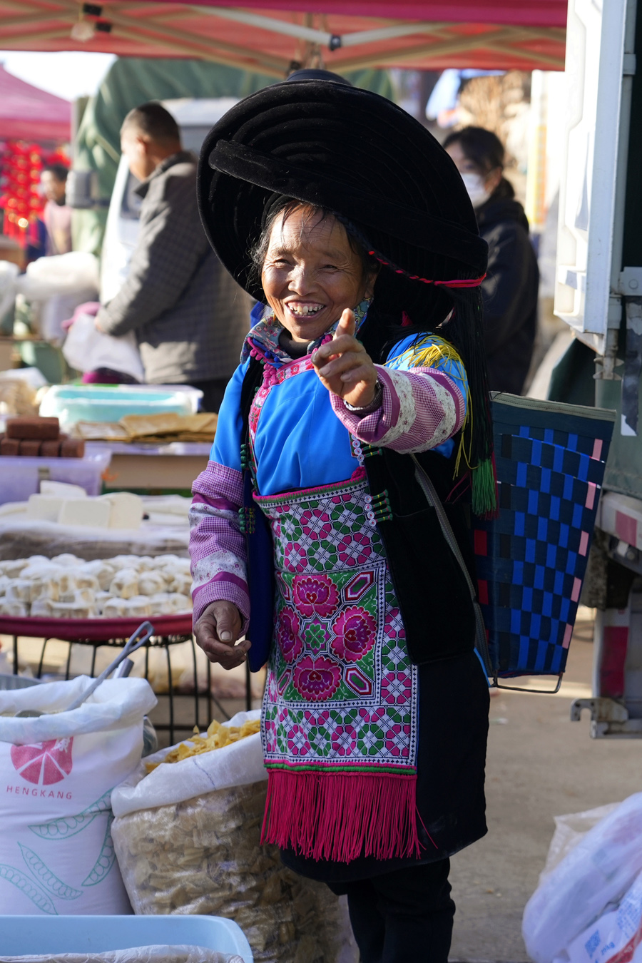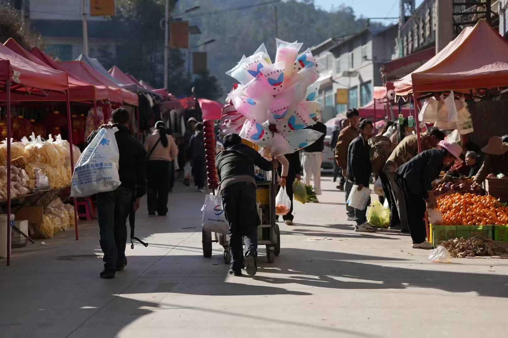 色彩之下,是藏不住的热闹烟火气。集市依着山势铺开,青色水泥路与乡间土路交错相连,摊位挨挨挤挤,人流熙熙攘攘。白族、彝族的乡亲们身着民族服饰,穿梭其间,叫卖声、谈笑声、孩童的嬉闹声、牲畜的叫唤声交织在一起,汇成一曲热闹的乡村交响乐。菜农们守着自家菜园刚摘的鲜蔬,热情招呼着往来行人;果农摆上枝头刚熟的鲜果,甜香随风飘散;小吃摊前,热气腾腾的米线、喷香的油条,香气扑鼻,勾得人驻足品尝;还有售卖竹编器具、手工刺绣、土产干货的摊位,每一件物件都带着乡土的温度,满是岁月的质朴。