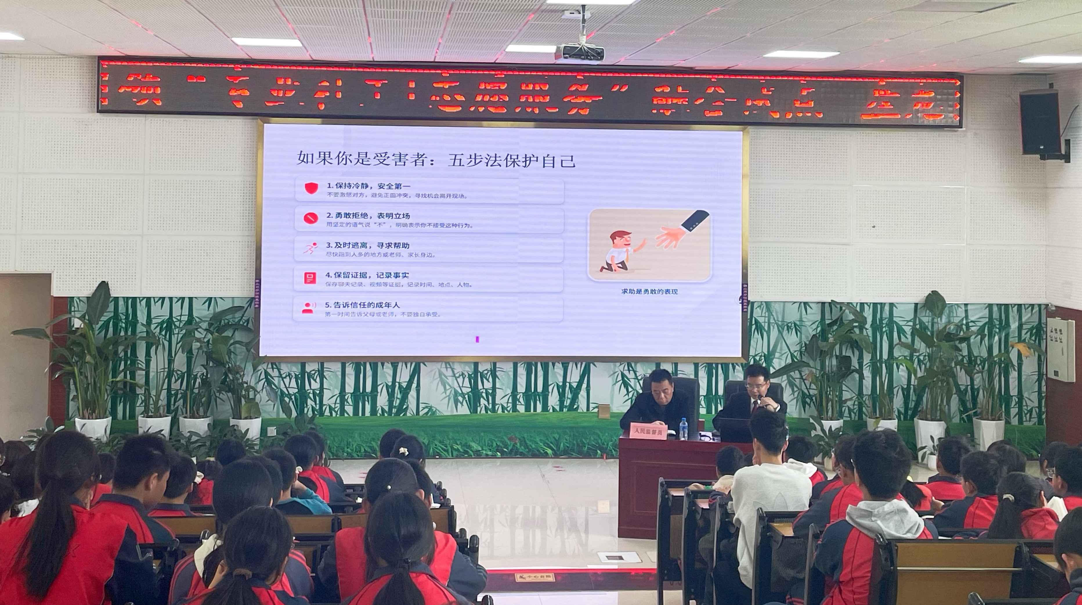 “面对欺凌,沉默即是纵容;伸出援手,就是向阳而行。”在应对求助环节,检察官鼓励学生不做冷漠的旁观者,更不做沉默的受害者,遇到困扰要勇敢向老师、家长或司法机关求助。同学们认真聆听,在互动中逐渐懂得:真正的成长,是内心有光,既能保护自己,也能温暖他人。