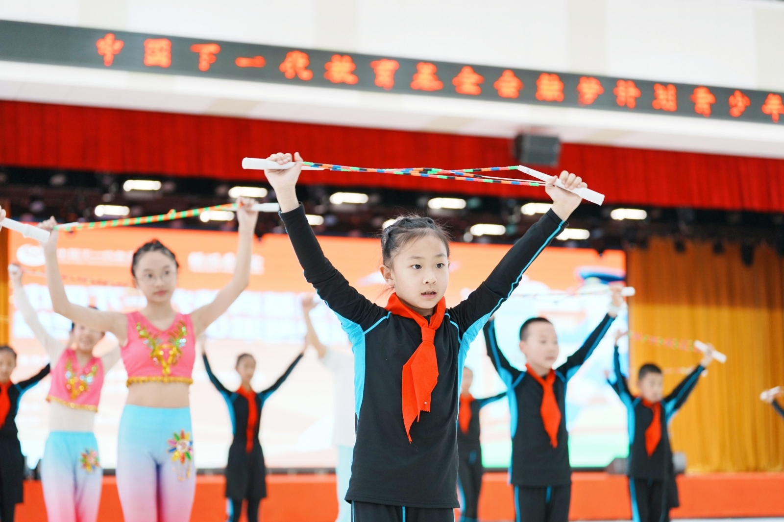 活动在庄重温馨的少先队员献系红领巾仪式中拉开序幕。随后,盘龙区金康园小学、盘龙区新迎第二小学和官渡区方旺小学的300名学生代表带来了活力四射的开场跳绳展演,瞬间点燃了现场的热烈气氛。