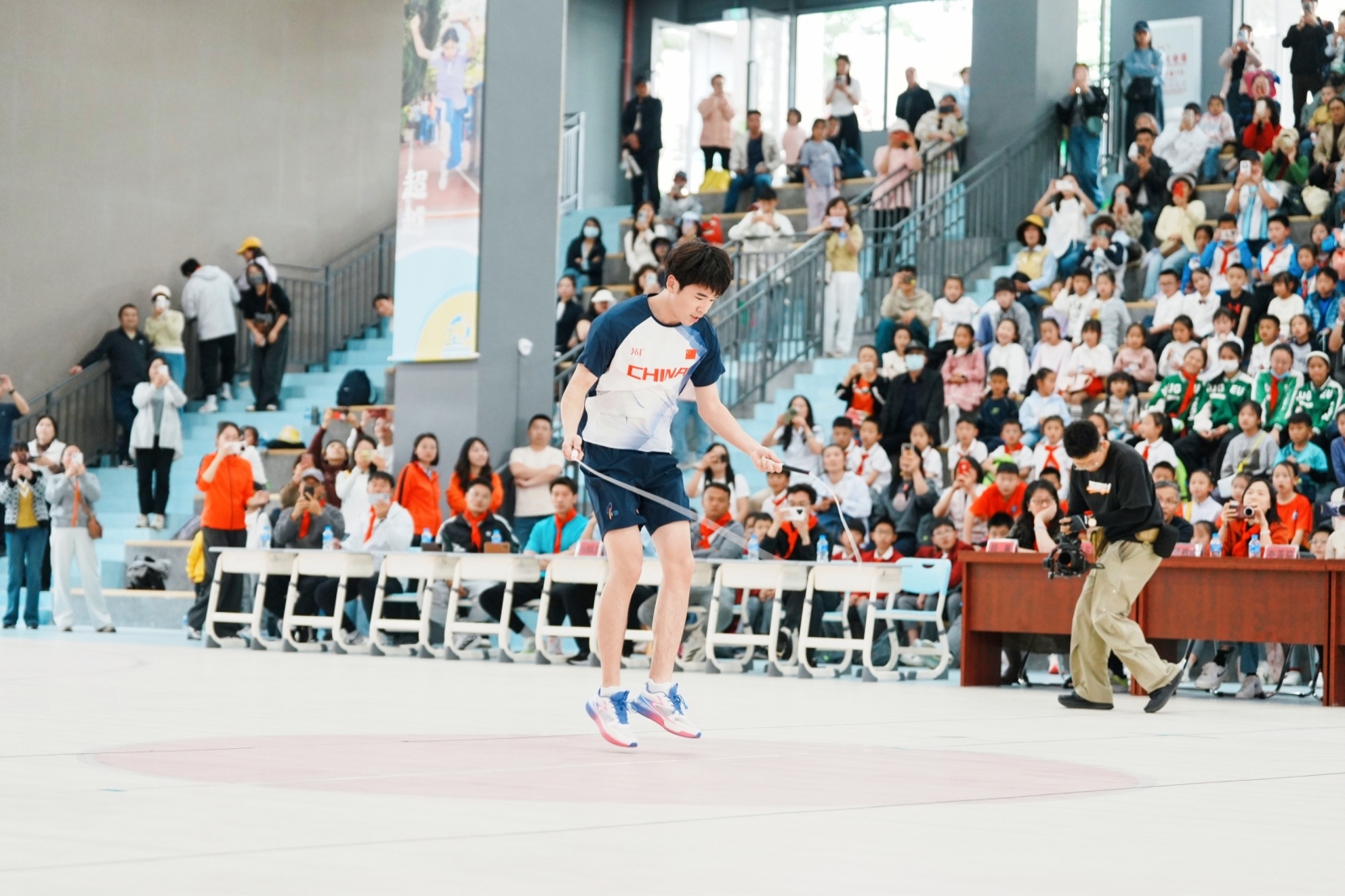 为让学生们接受最专业的体育指导,本次活动特别邀请了中国少数民族体育协会跳绳运动委员会技术顾问、国家跳绳队教练许凡,以及中国跳绳运动员、世界跳绳锦标赛冠军刘泽瑞康来到现场。在“跳绳公开课”环节,许凡教练用生动易懂的语言为在场学生讲解了跳绳的标准动作要领与运动损伤预防知识,世界冠军刘泽瑞康则同步进行了慢动作拆解示范。
