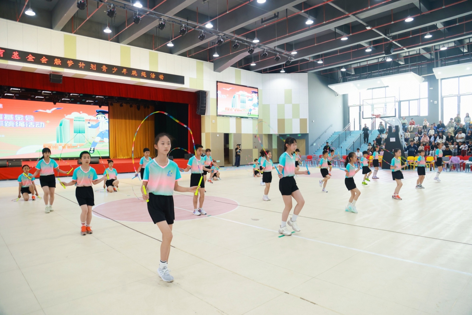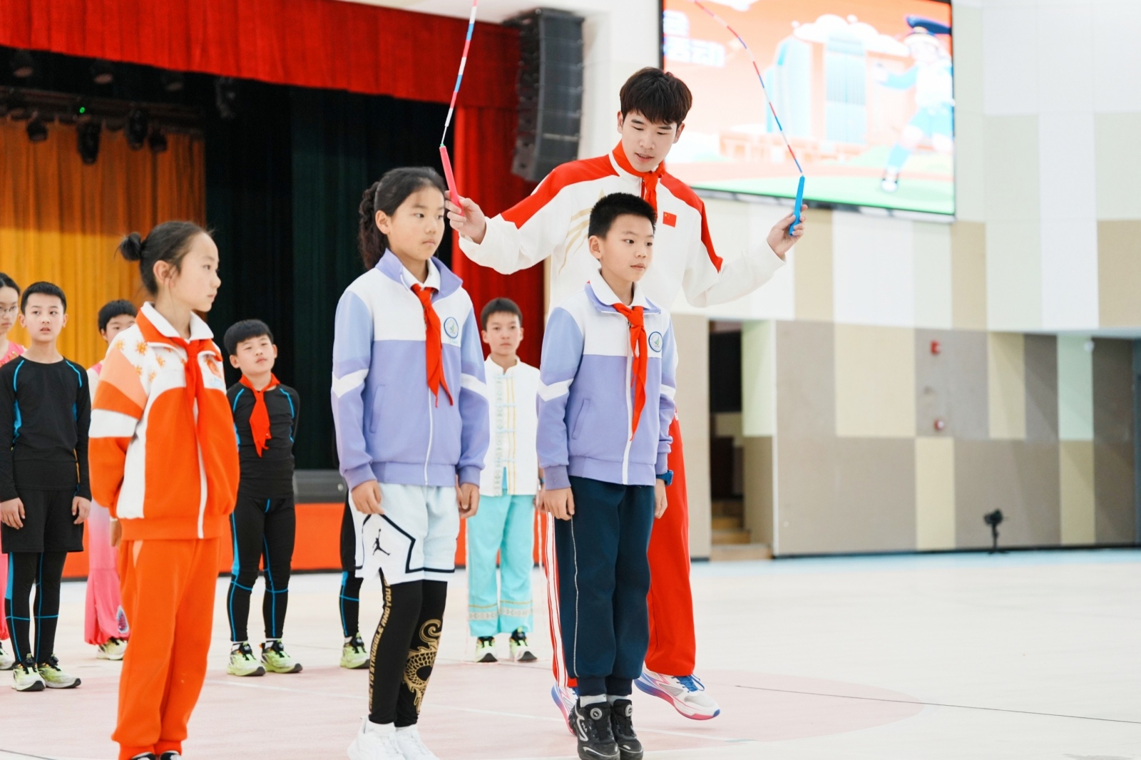 在现场互动环节,教练团队带领学生们体验了“双人同频跳”“一带一花式跳”“交互绳初体验”以及“多人集体同步跳”等趣味挑战。孩子们在专业指导下踊跃上台,在欢乐的跳跃中不仅学习了科学的跳绳技巧,更深刻体会到了团队协作的体育精神。随后,刘泽瑞康带来了一场包含多摇、体操融合等高难度动作的花样跳绳展演,将全场气氛推向高潮,赢得了师生们的阵阵欢呼与掌声。