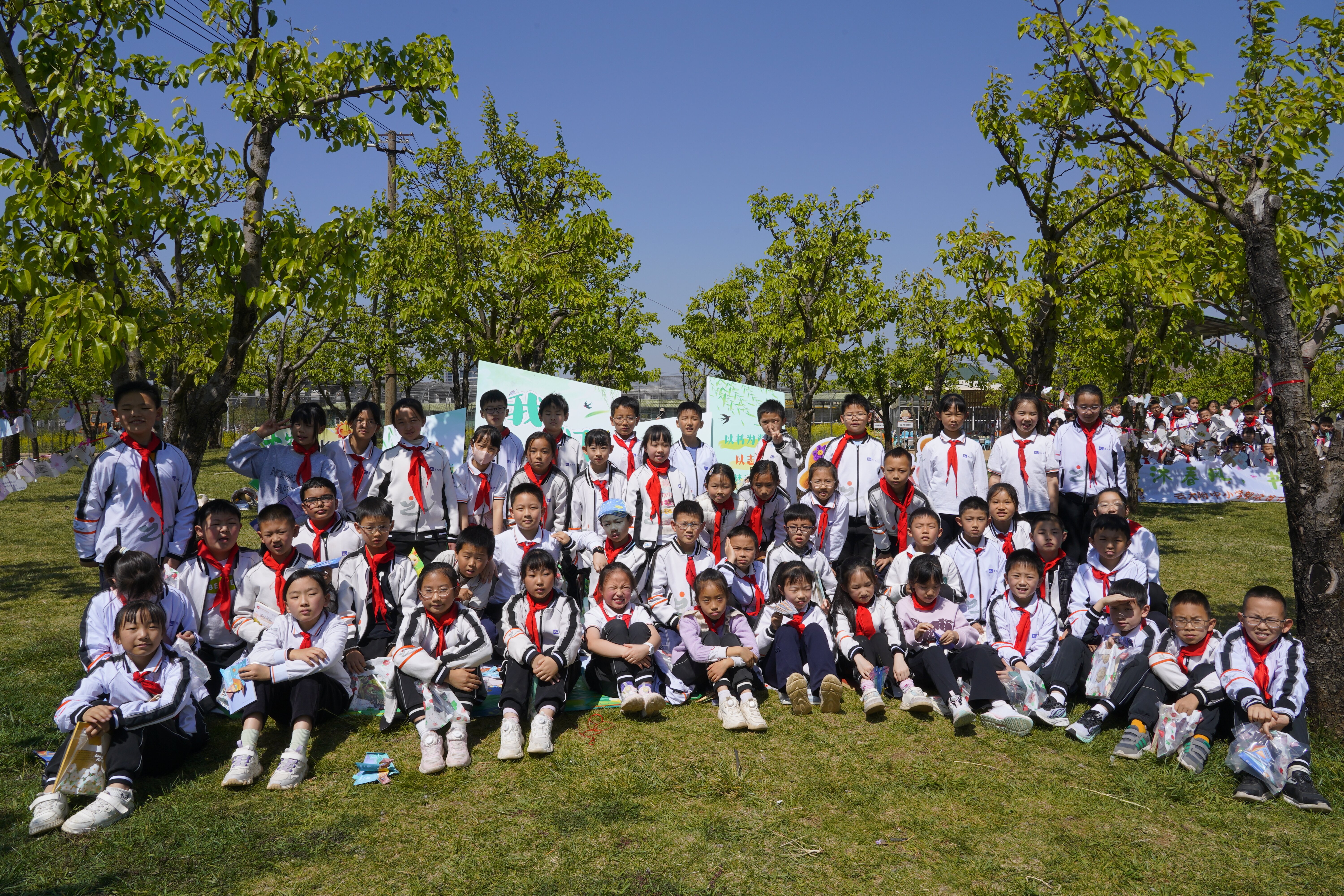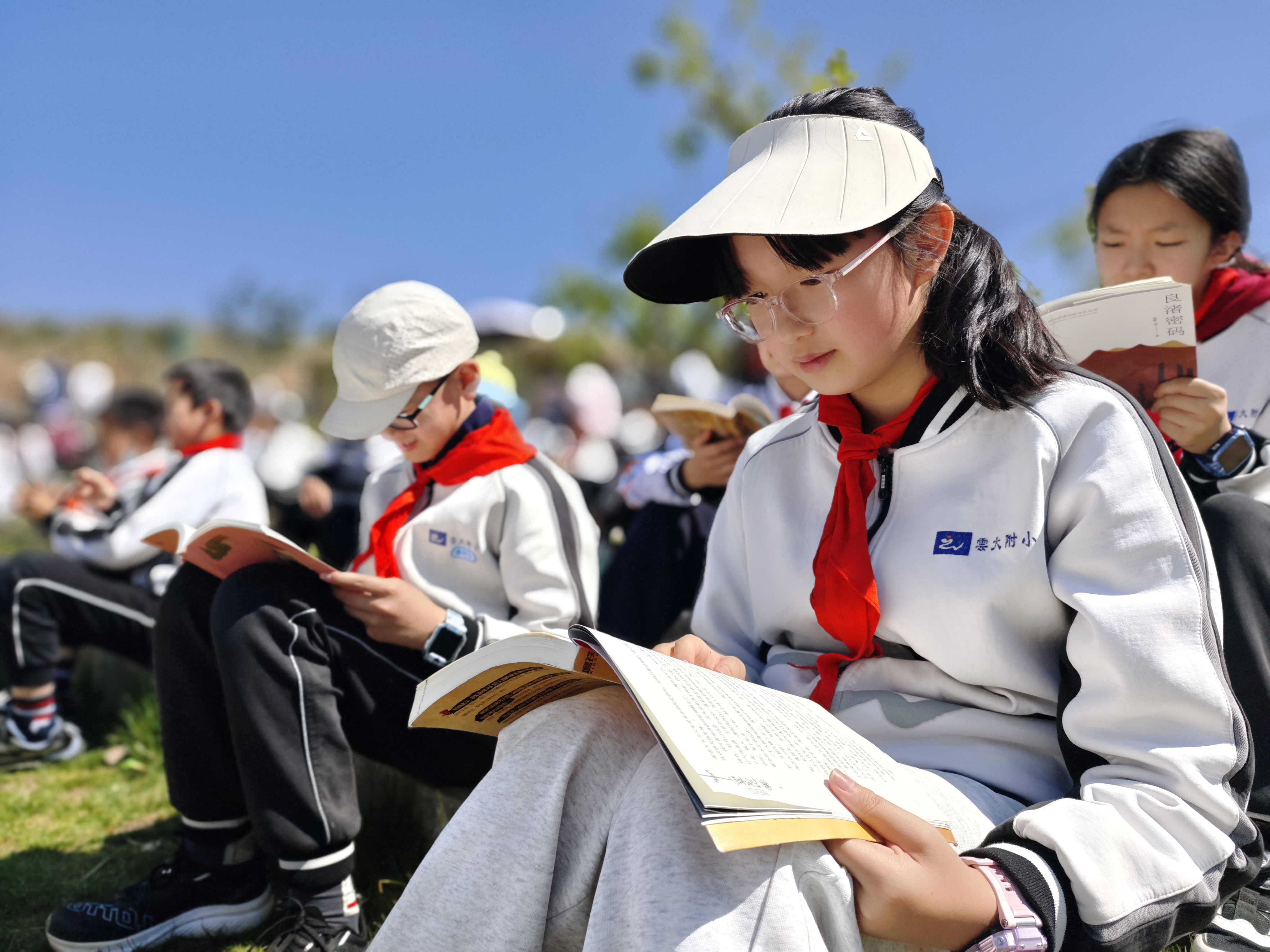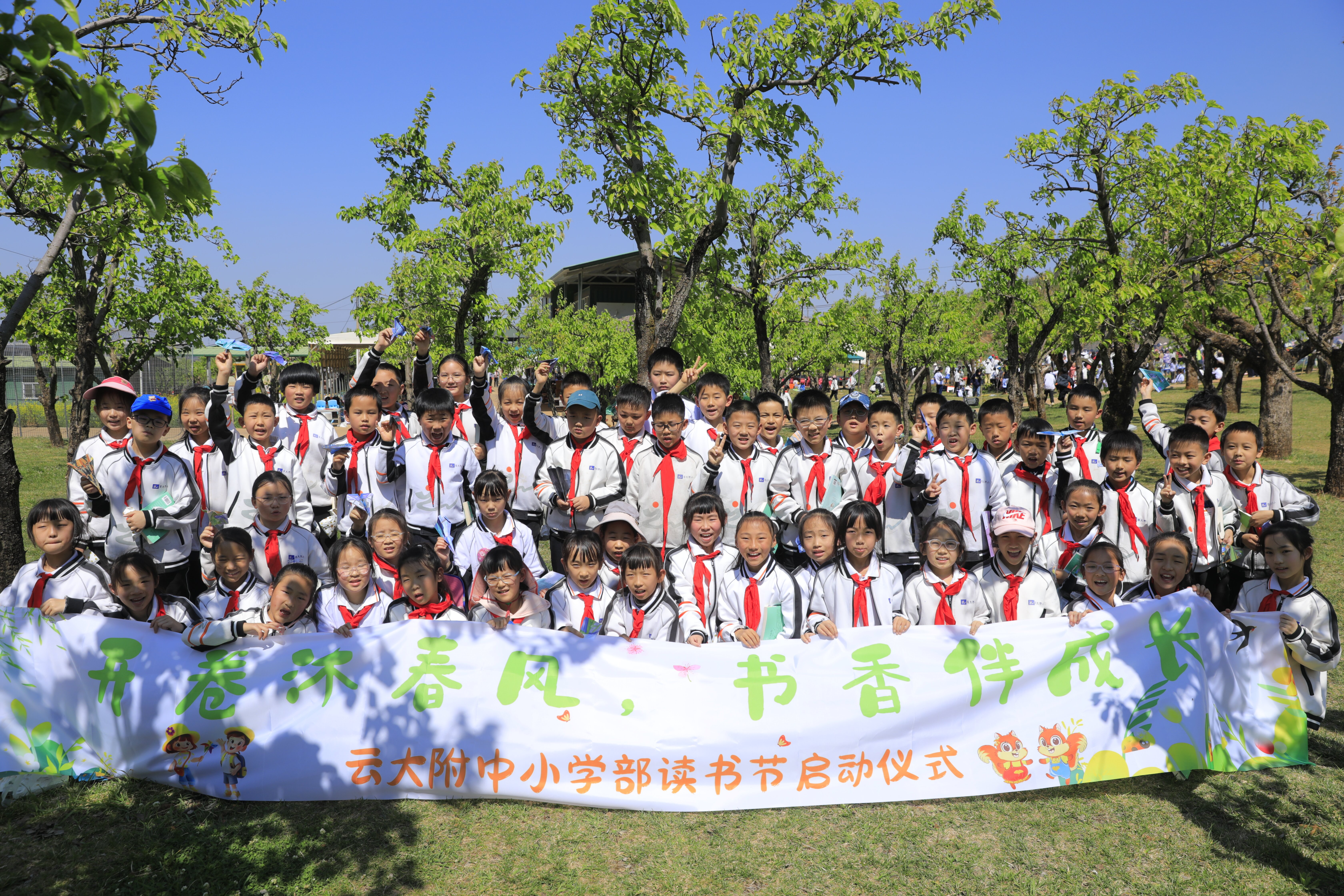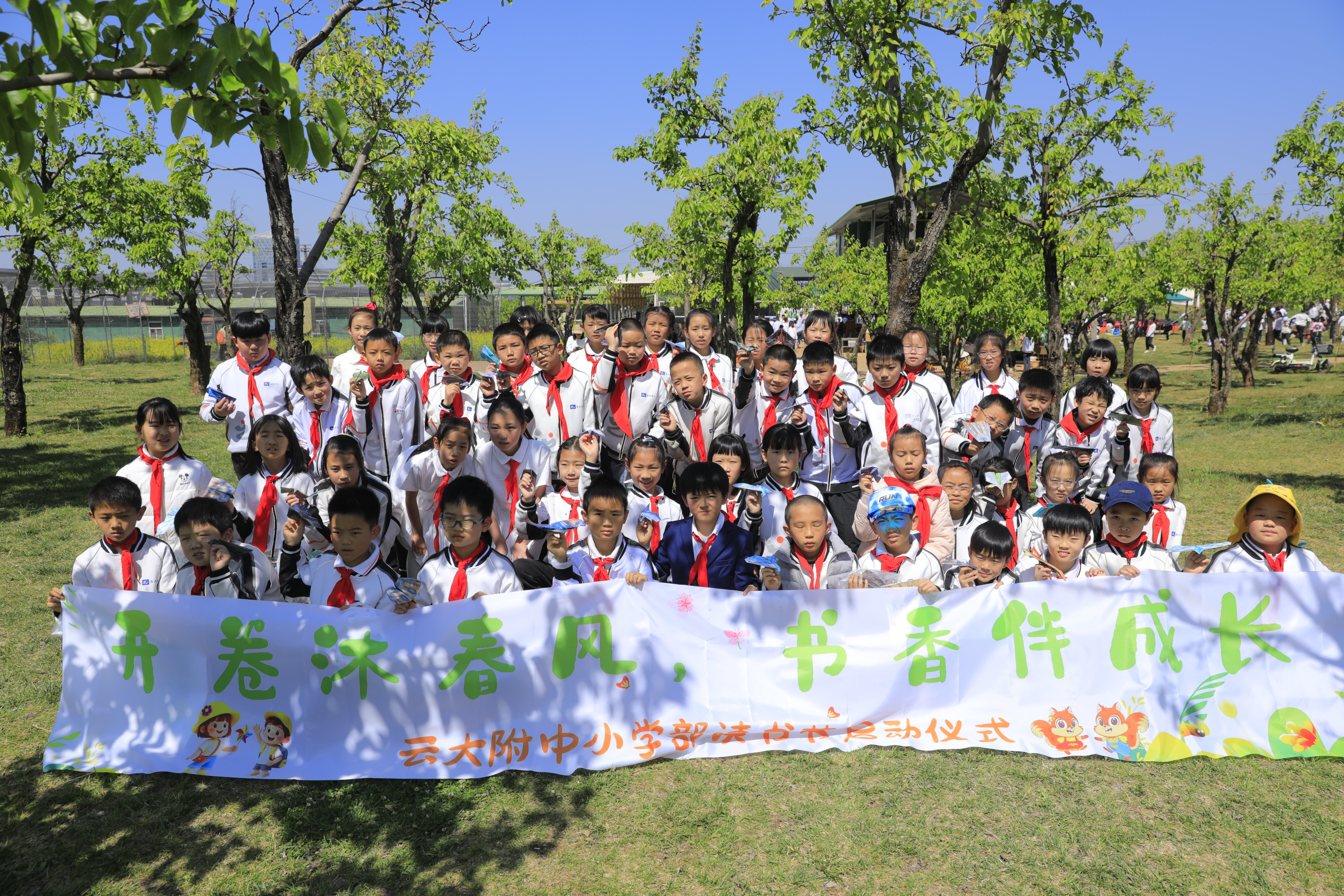春风拂过万溪冲的千亩梨园,花瓣轻落,书香肆意弥漫。3月27日,云大附中小学部(以下简称:云大附小)将读书节启动仪式搬到了呈贡区万溪冲的五谷良田农场,在烂漫春光里,为全体学生开启了一场以“开卷沐春风,书香伴成长”为主题的阅读之旅。