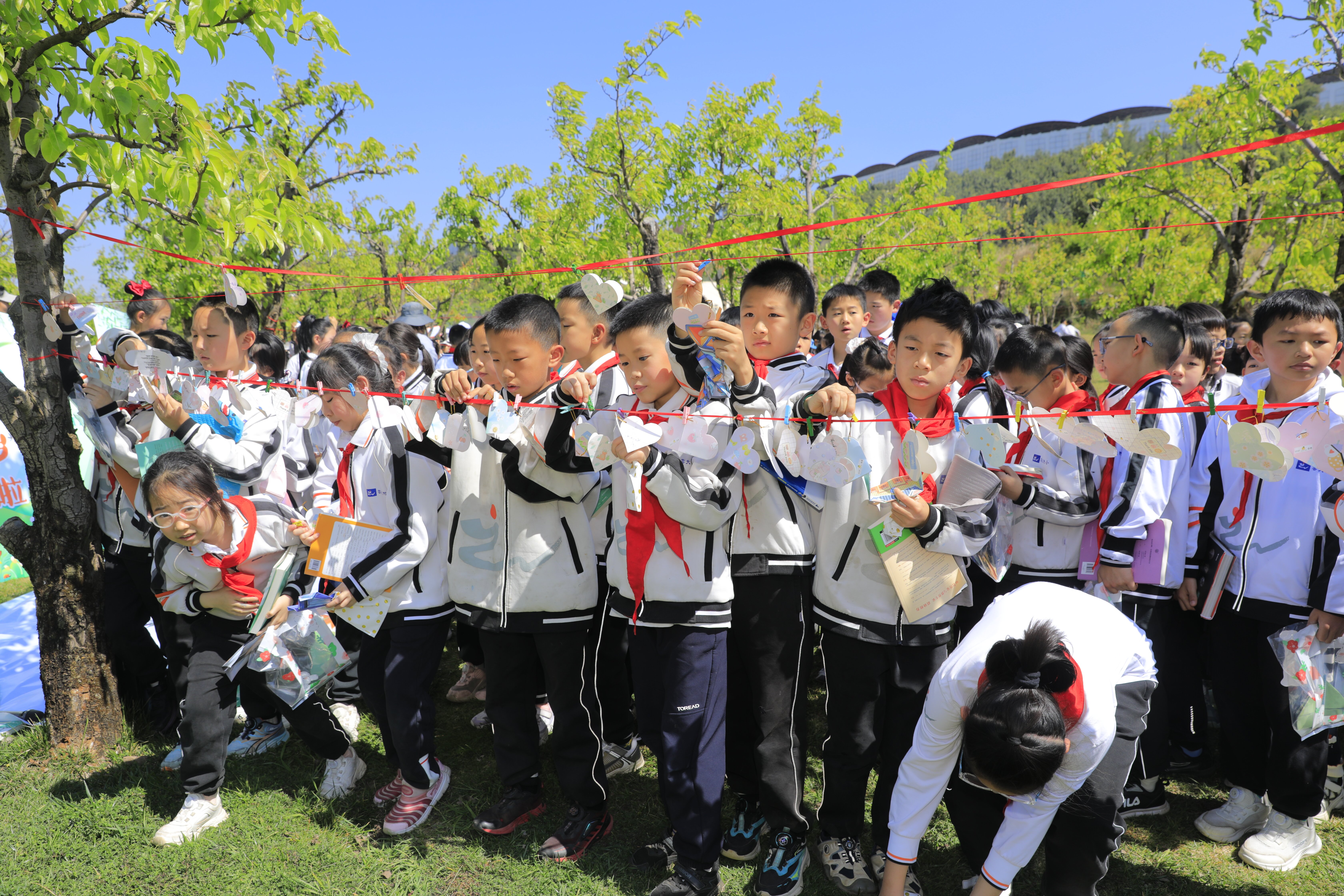 活动现场,千亩宝珠梨园成为天然的育人课堂。活动伊始,学生们漫步于梨园小径,寻春赏景,感受自然的诗意。随后,大家围坐在梨树下,开始了沉浸式的共享阅读。春风翻动书页,文字与花香交织,让静心阅读成为成长里的日常,让文字力量浸润每一颗童心。