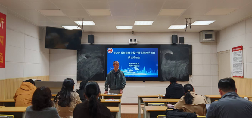 当日下午,调研反馈总结会在五楼会议室召开。进修学校领导及各学科教研员,与昆明铁路五中所有行政干部、教研组长及初三年级教师深入交流。会议上,初三年级组长陈老师系统汇报了年级组复习备考的整体规划与阶段成效。随后,各学科教研员结合实地观察,从教学目标设定、课堂活动设计、学生主体参与等维度,逐一反馈调研结果。