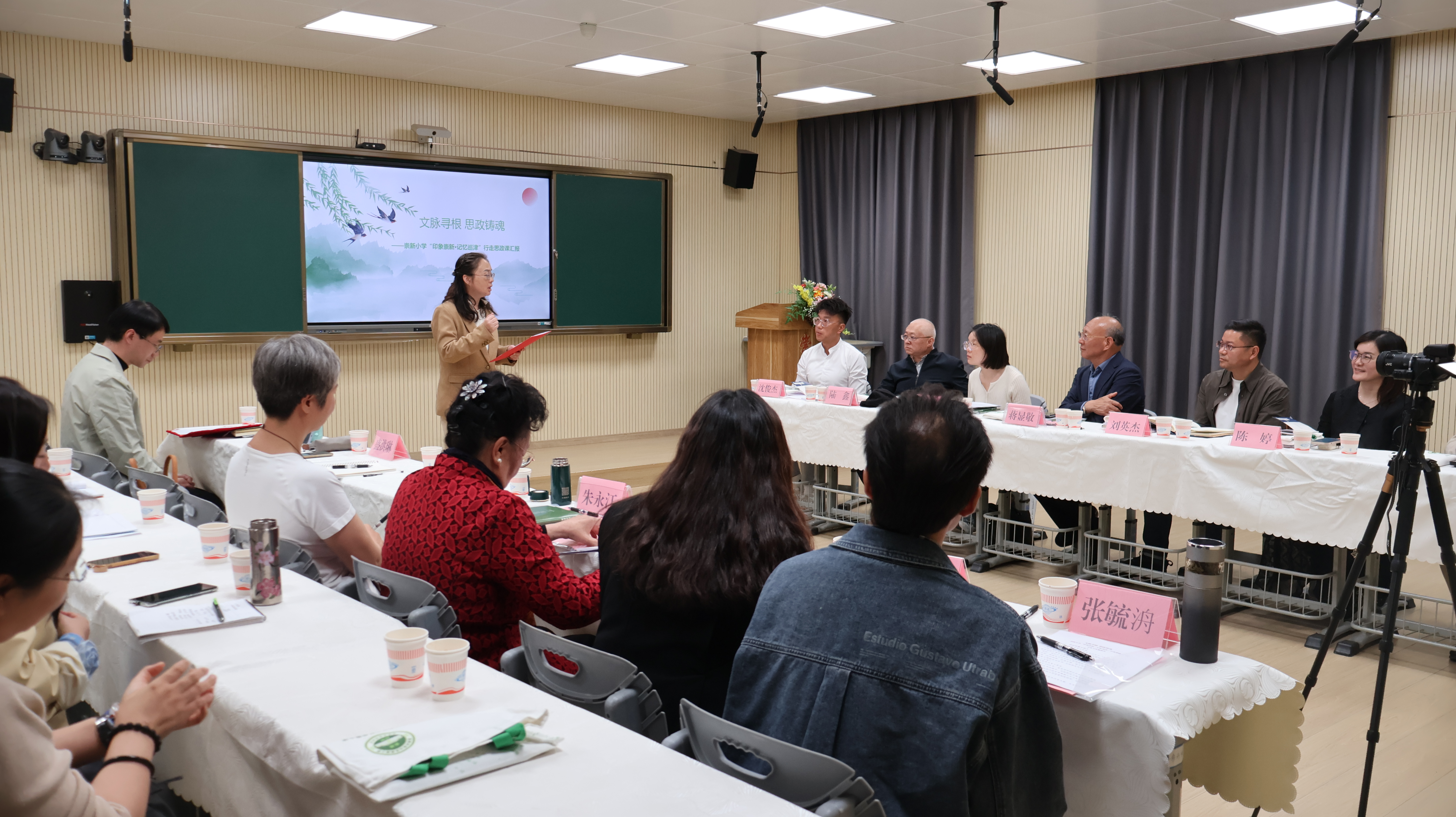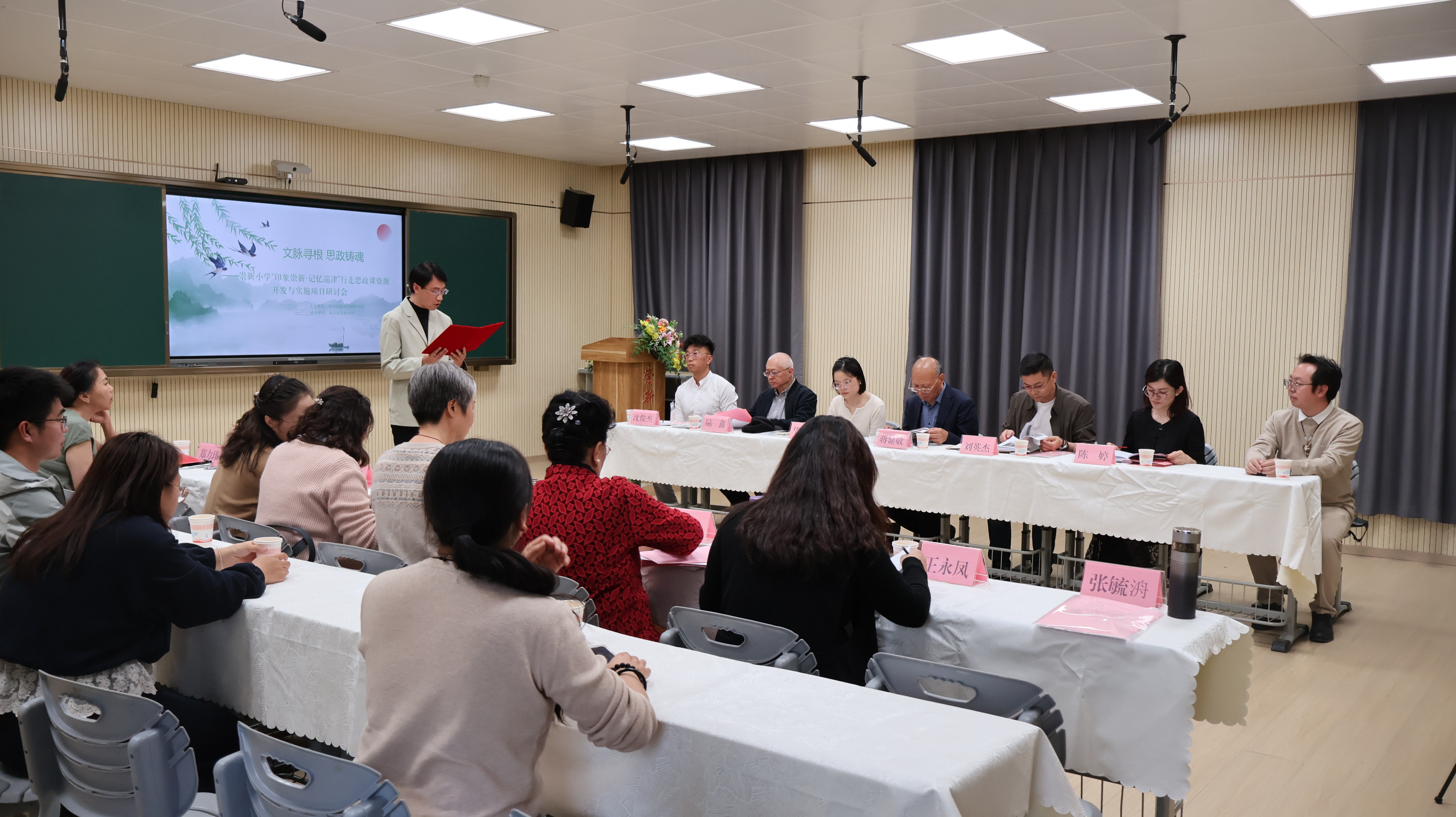 参观结束后,研讨会在学校多媒体室举行,由学校党支部副书记郑力玮和江苏省江阴市辅延中心小学沈俊杰主任共同主持。全体人员共同观看学校与社区宣传视频,直观了解“印象崇新・记忆巡津”项目实施基础与校社协同育人背景。随后,崇新小学科研主任陈梅围绕项目背景、育人目标、实施路径、资源整合、阶段成效与现存问题,全面汇报“文脉寻根 思政铸魂”行走思政课项目开发实施情况,清晰呈现项目落地全过程,为专家精准指导提供依据。