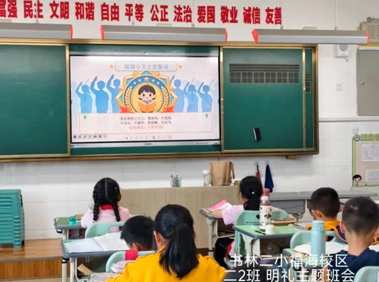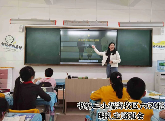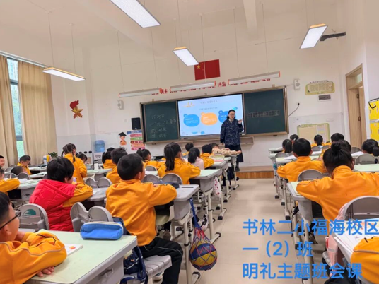 3月25日下午,西山区书林二小福海校区1-6年级同步开展了“五礼”主题班会系列课程之明礼主题教育。本次“五礼”主题班会以“明礼”教育为内涵,以“书林茂德 笃行致远”为主旨,围绕“肩上有责任”的育人目标,针对不同学段学生的认知特点,开展了分层化、序列化的主题班会。