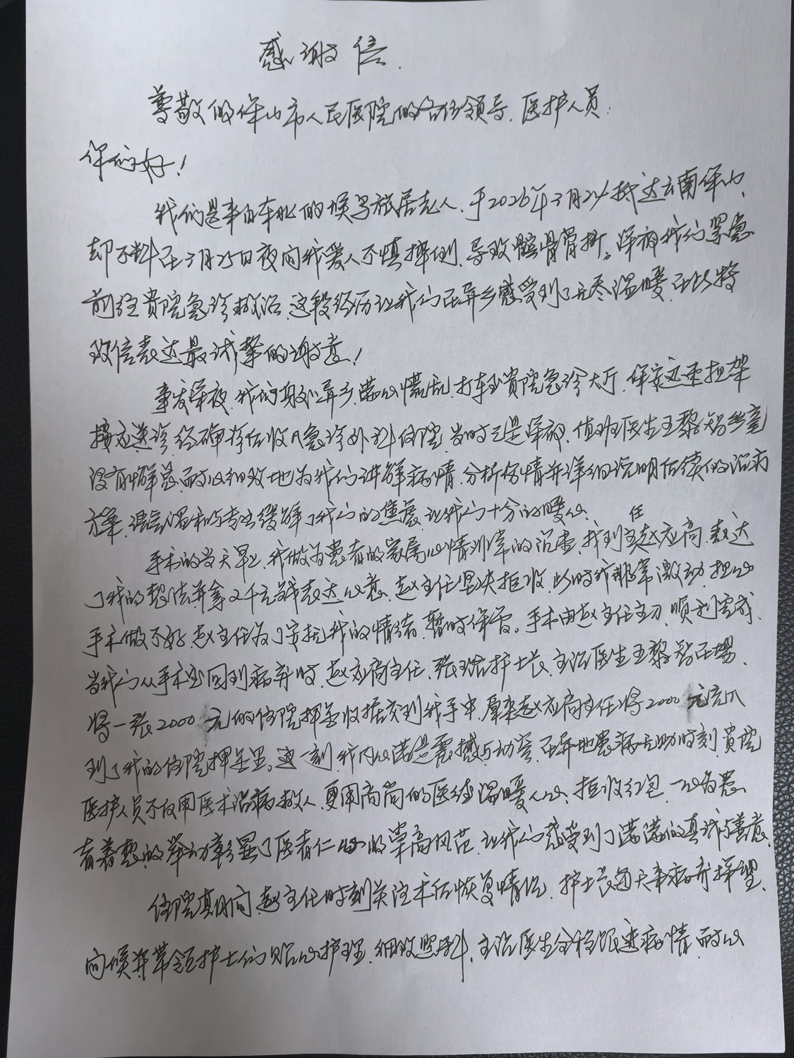 “我们回去后,会把在保山感受到的这份温暖广为传播,让更多的家乡人知道保山市人民医院医护人员的高尚医德,让更多候鸟老人来保山旅居,感受这片土地的美好与温情。”3月30日,从东北来保山旅居的6旬老人王大爹在住院期间,写下了一封饱含深情的感谢信。几天前,王先生不慎摔倒导致髌骨骨折,而就在手术前,他的妻子祁阿姨硬塞给医生一个2000元的红包,没想到,接下来发生的一幕,让两位老人既意外又动容。