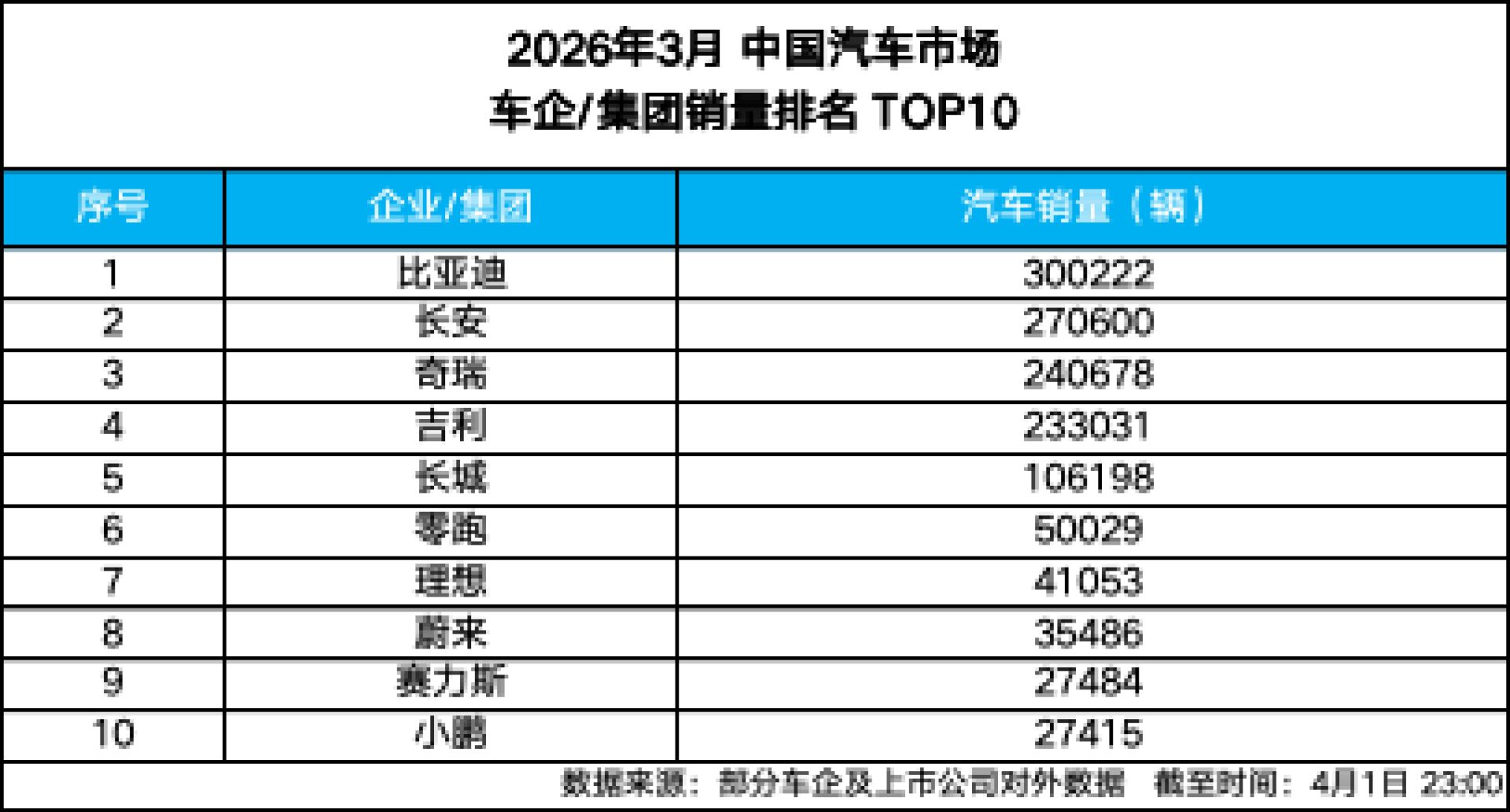 4 月 1 日,比亚迪发布 2026 年 3 月产销数据,单月总销量达300222 辆,强势突破 30 万辆大关,斩获中国车企销量冠军,并连续 58 个月蝉联中国新能源汽车销量冠军,持续稳固行业龙头地位。截至目前,比亚迪新能源汽车累计销量已超1580 万辆,一季度累计销售 700463 辆,以硬核数据印证技术与规模双重实力,助力一季度完美收官。