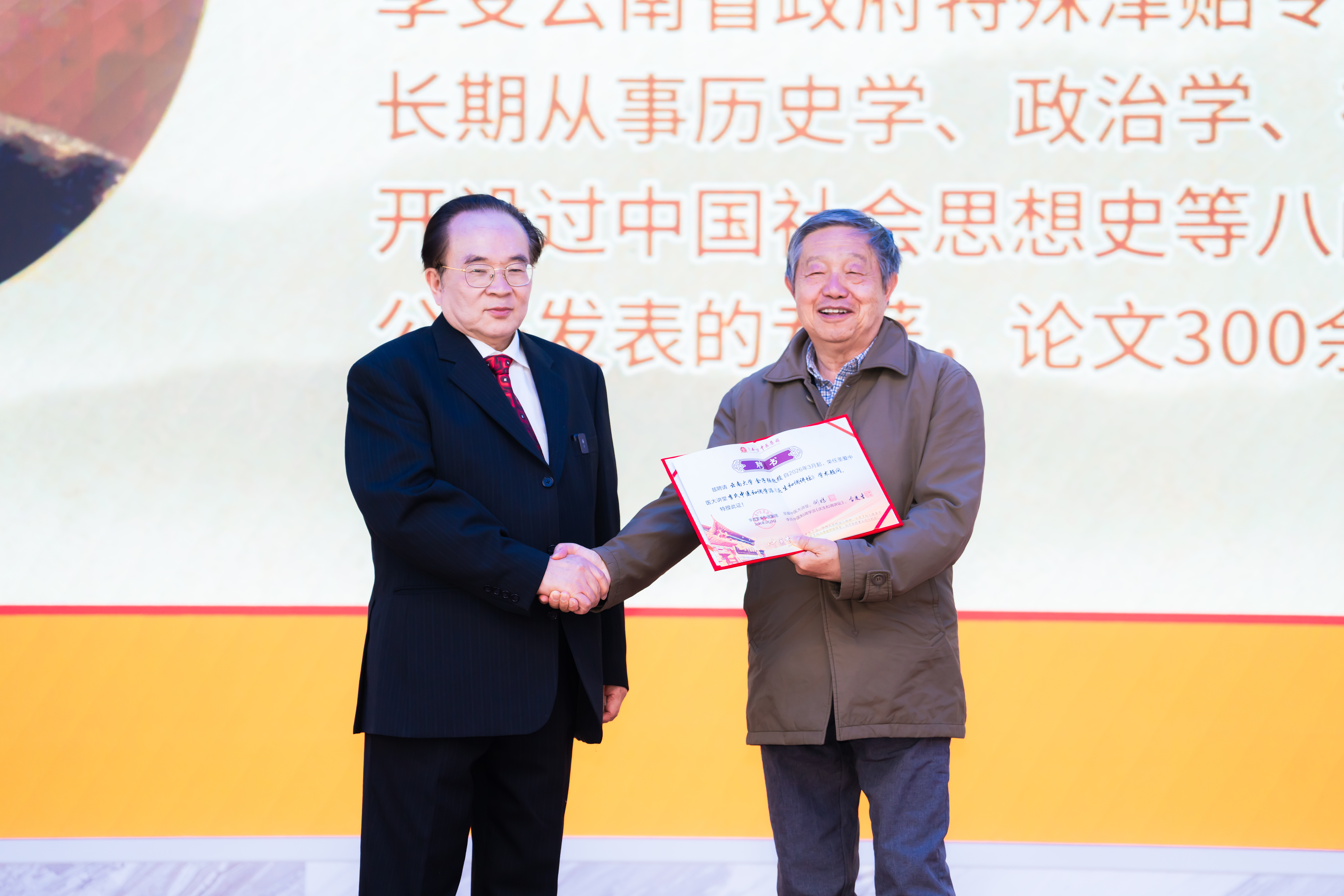 活动现场,《庆生和调讲坛》坛主李庆生向云南大学教授金子强颁发学术顾问《聘书》。